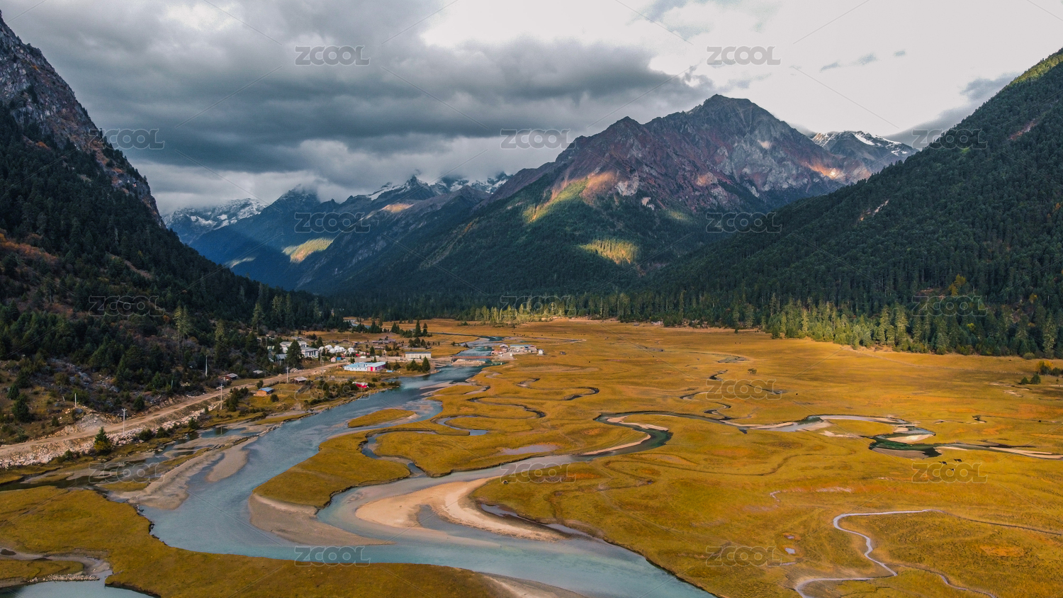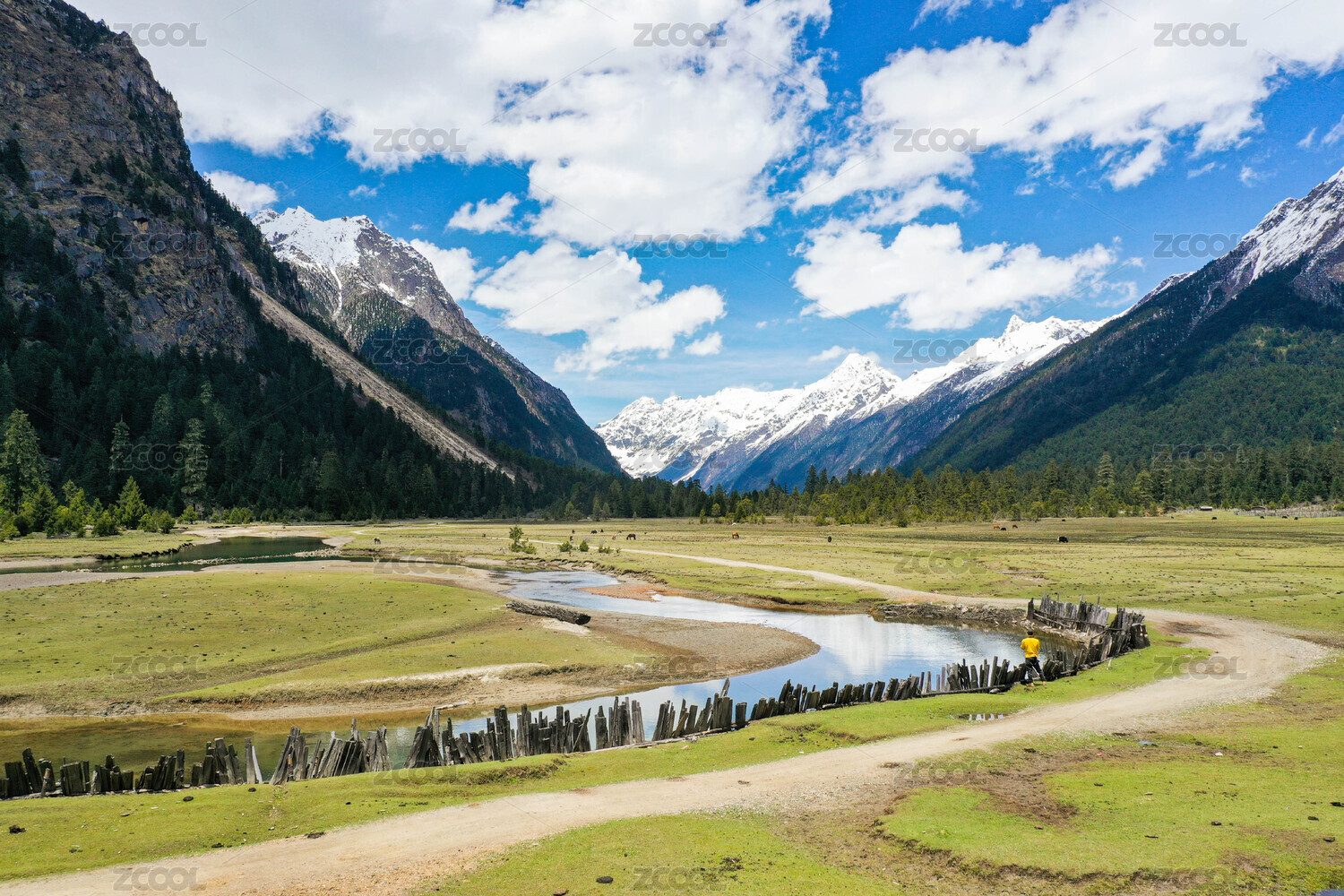 中国西藏波密岗云杉林森林河流乡村田园风光