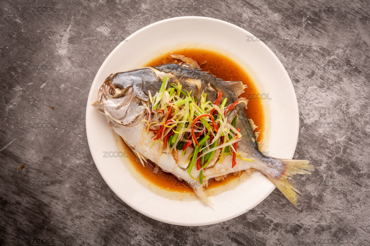 厨房台面上一道烹饪好的中国菜清蒸金昌鱼