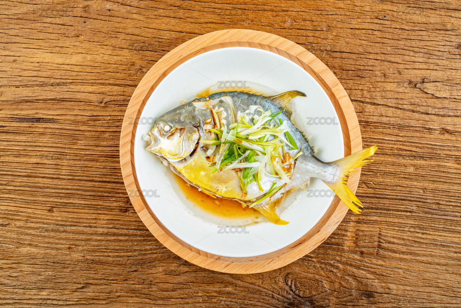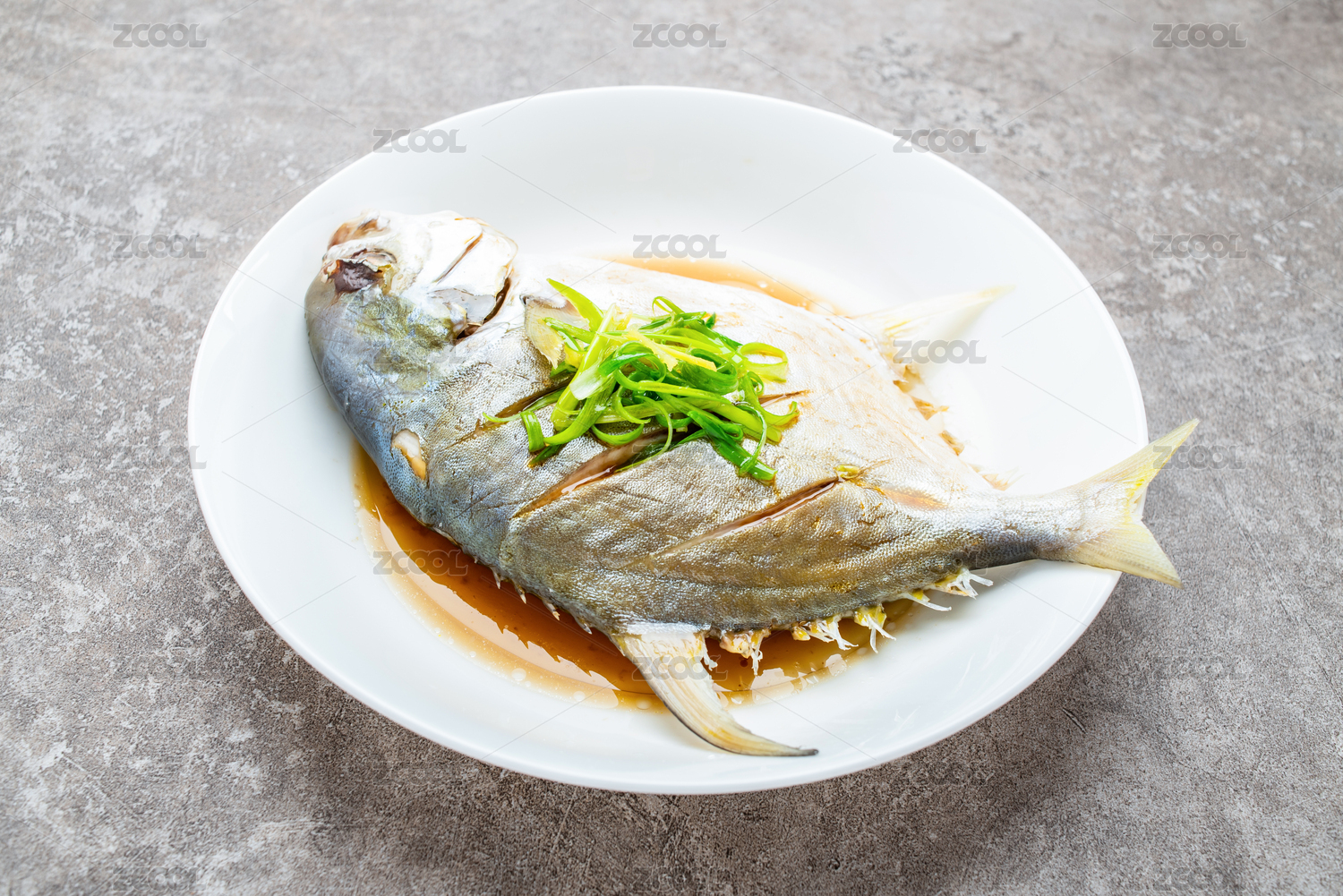 厨房台面上一道烹饪好的中国菜清蒸金鲳鱼