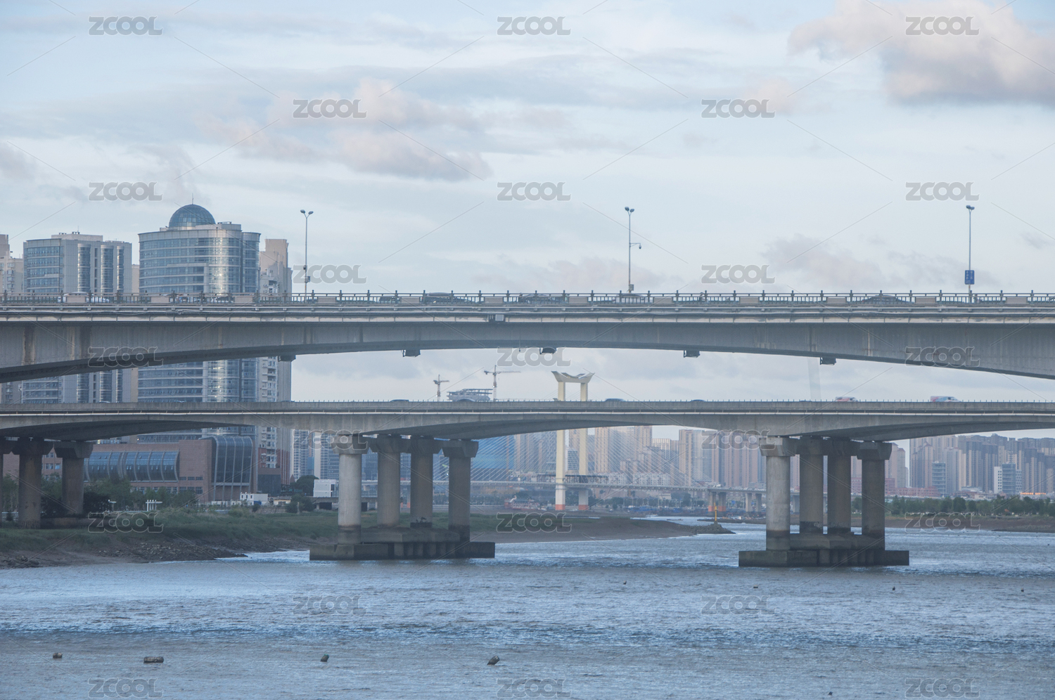 暴风雨来临时的城市桥梁上风光与远处的蓝天