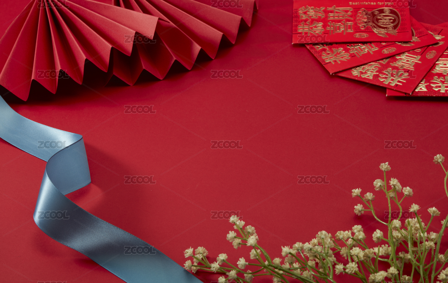 中国新年主题红色背景红色折扇和恭喜发财红包和满天星花和蓝丝带