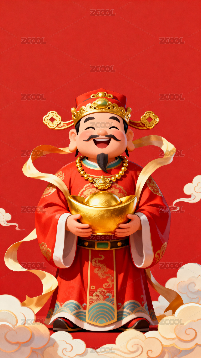 财神爷送元宝祥云背景