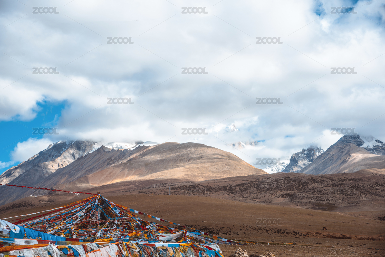 中国西藏拉萨市当雄县雪山草原上的经幡夏季风光