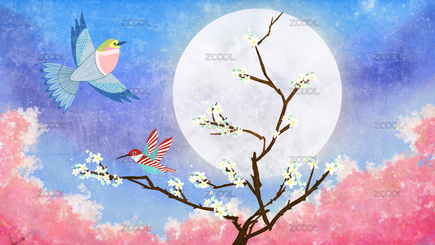 月下花丛与鸟儿