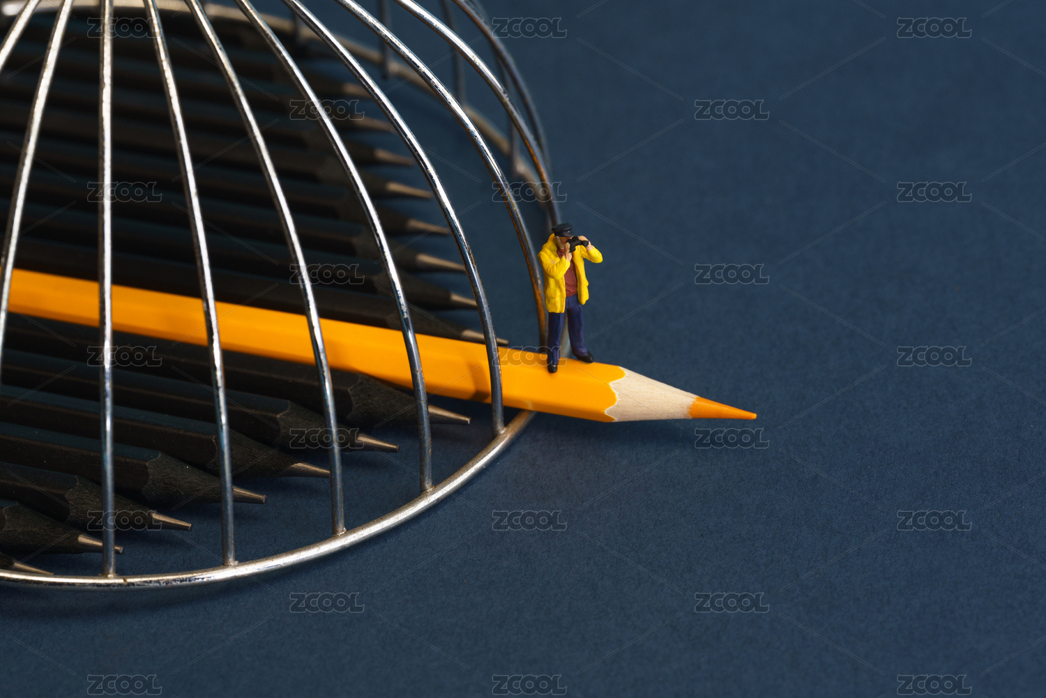 站在突破牢笼黄色铅笔上的男士微缩创意