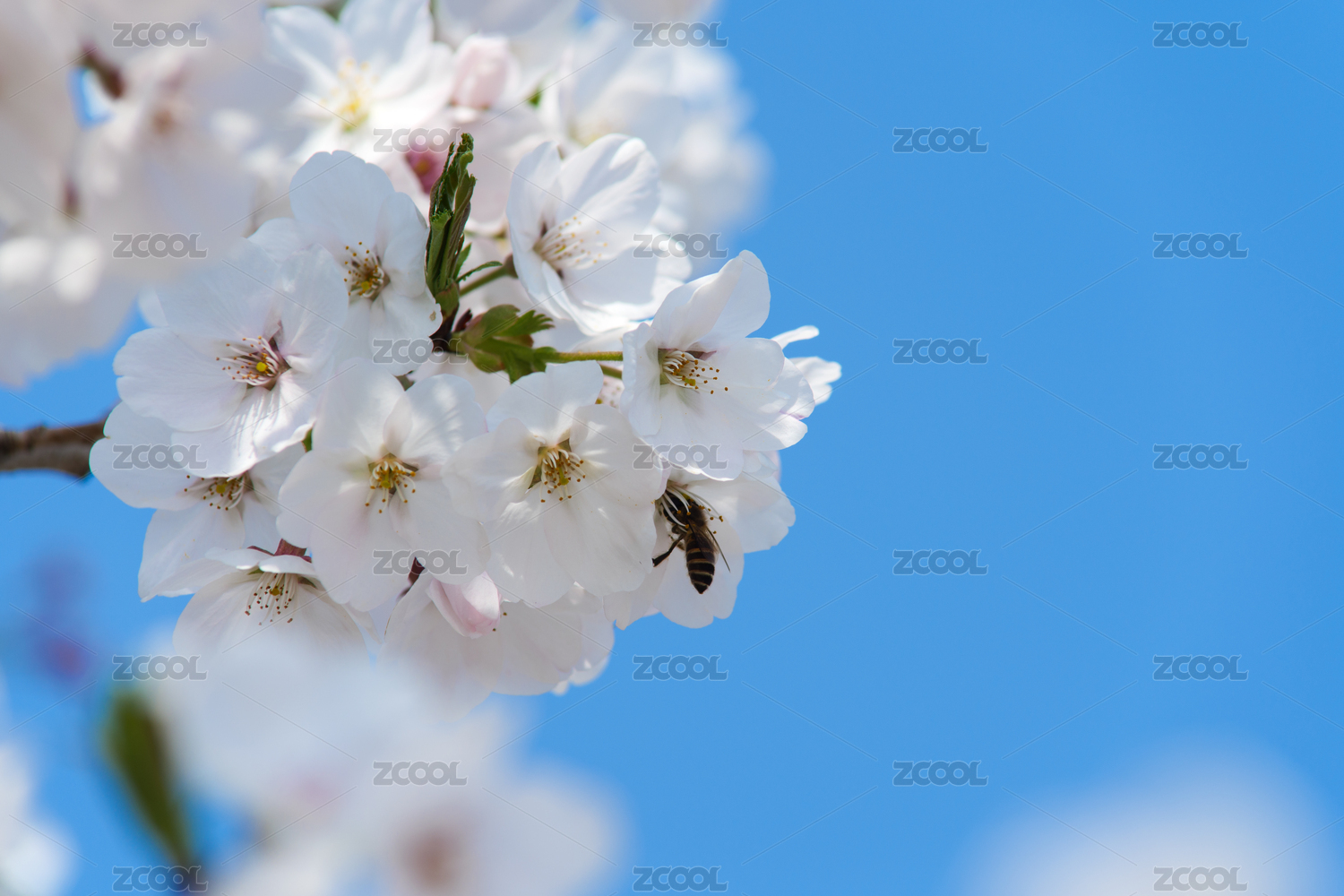 蓝天下盛开的白色樱花和采蜜的蜜蜂
