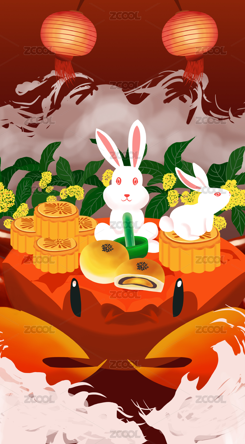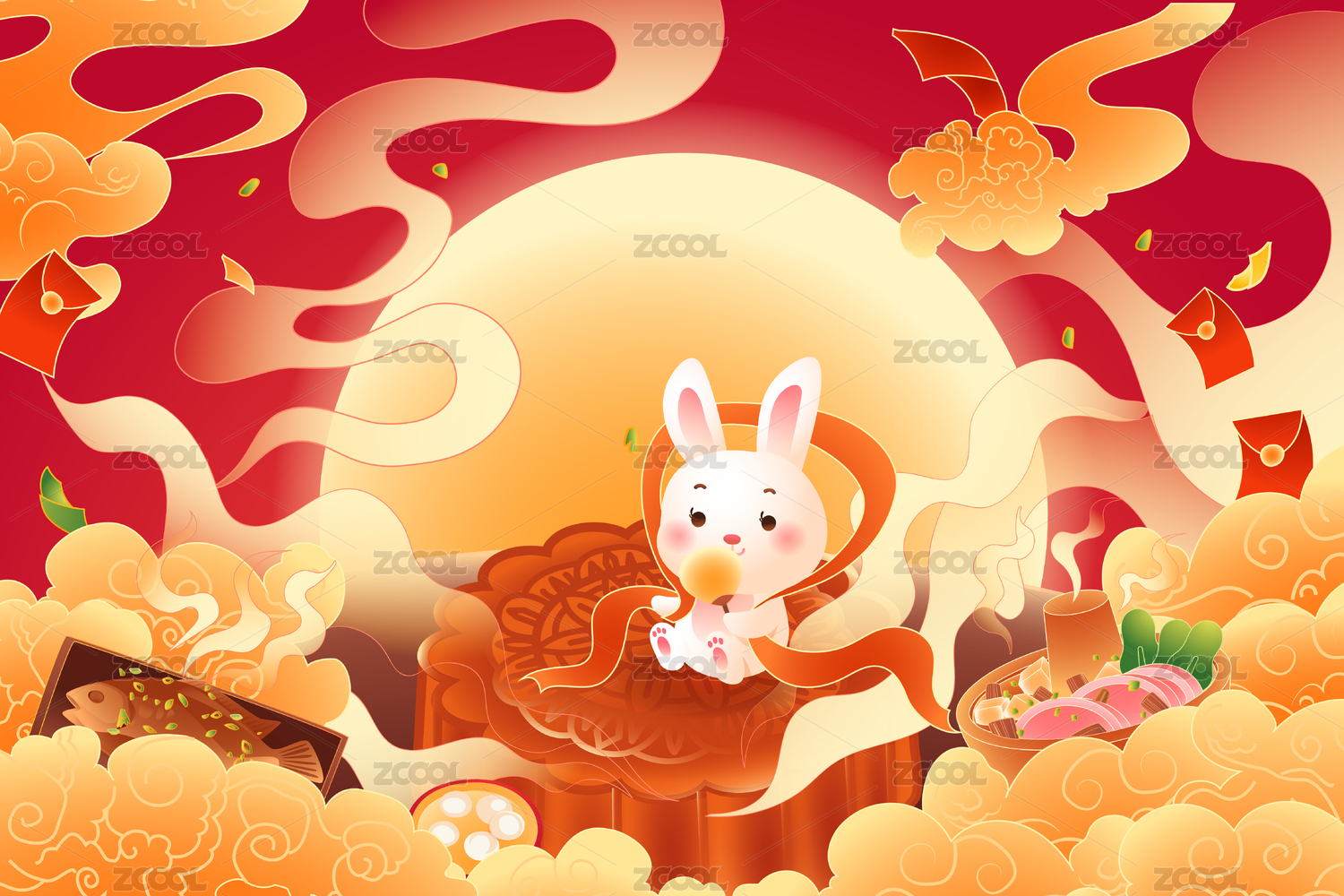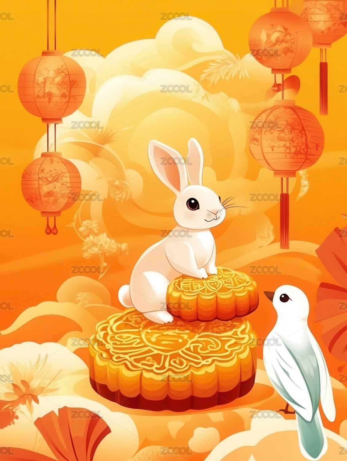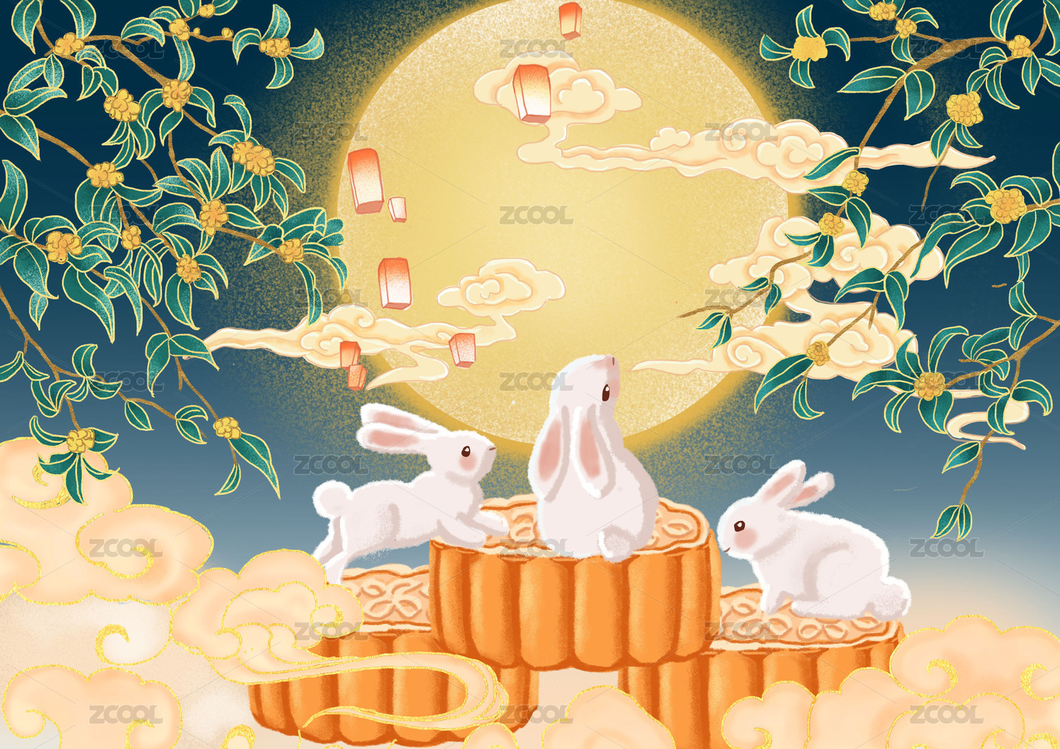 中秋节兔子赏月和月饼桂花酒坛等插画