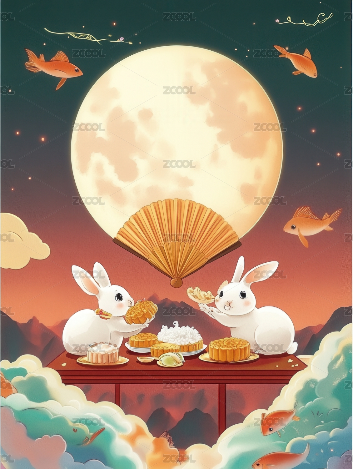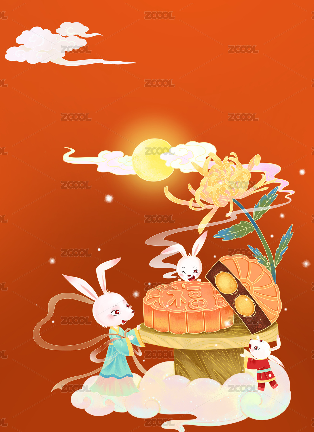 中秋节海报插画几只兔子玉兔在月下玩耍庆祝