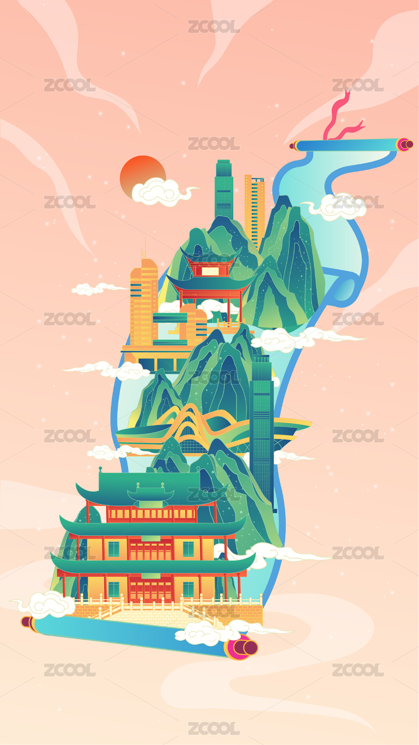 中山卷轴山水画中国风城市复古打卡地标旅游