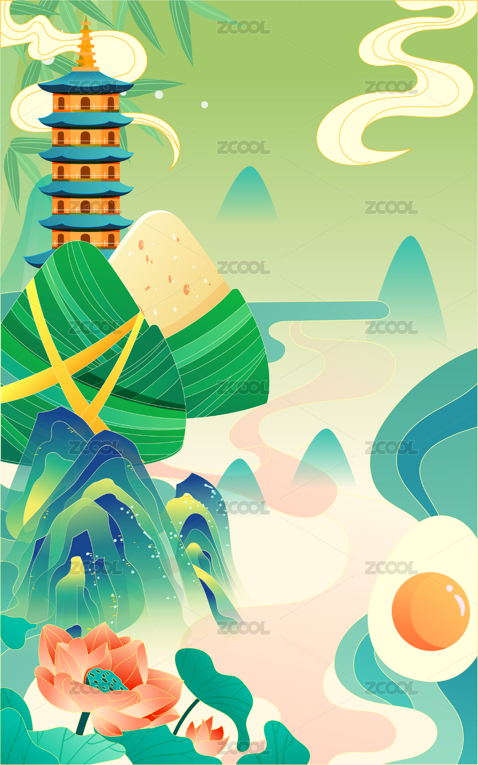 五月初五端午节快乐卡通粽子赛龙舟国潮插画