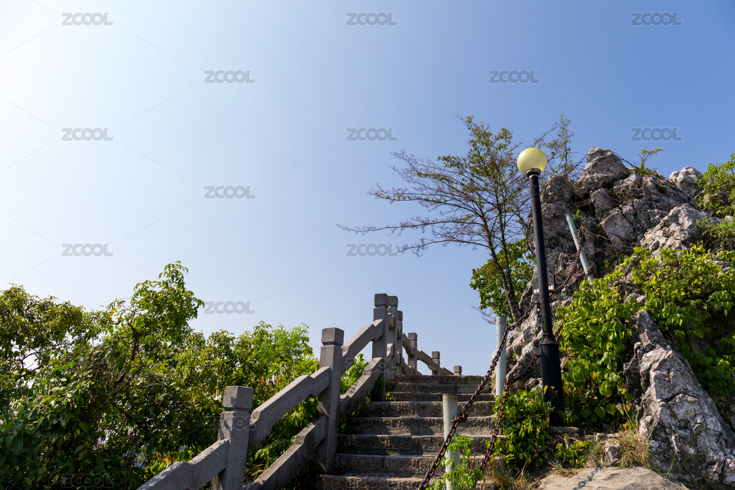 中国深圳梧桐山,蓝天下的登山石阶长廊
