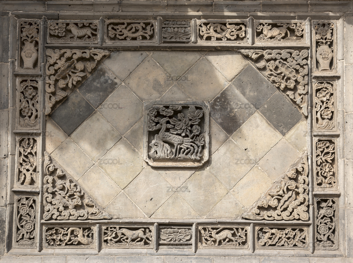 山西省平遥古城清代古民居马家大院内的灰砖墙砖雕