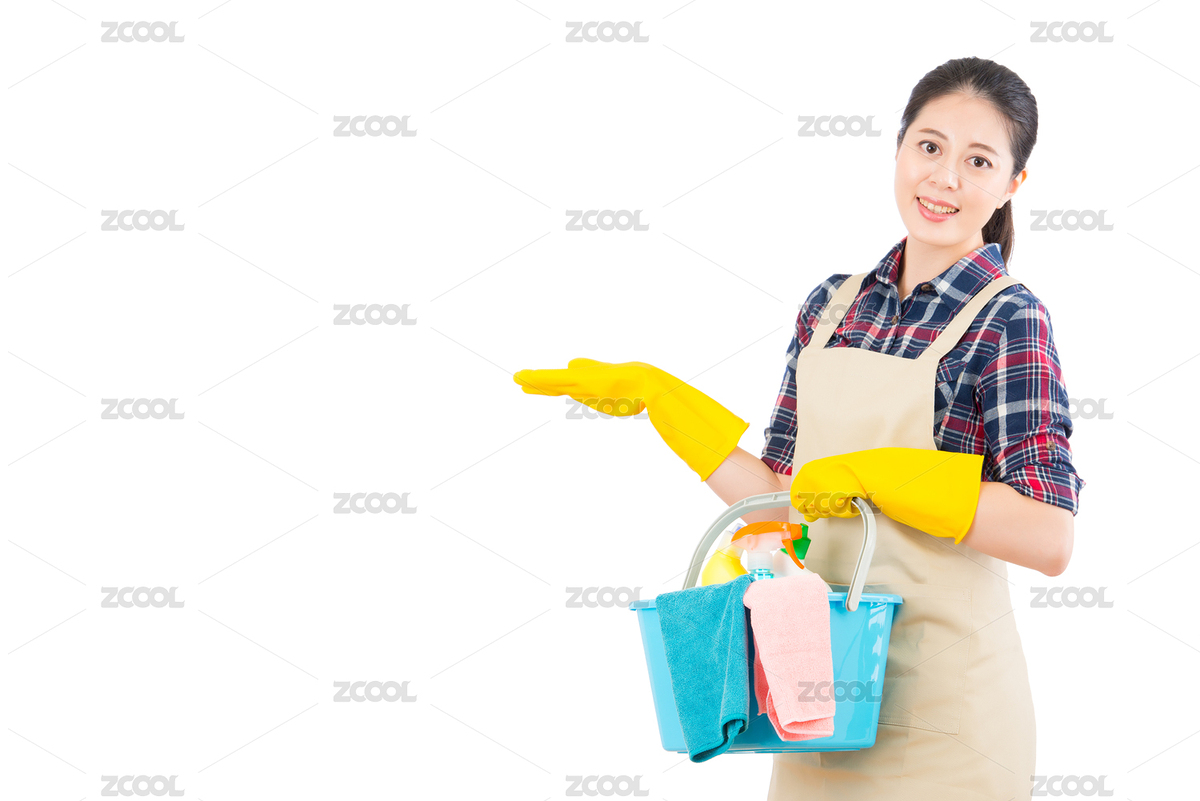 年轻女子拿着清洁工具和产品,在斗隔绝在白色背景。美丽的新鲜活力的多民族中国的亚洲女模特。