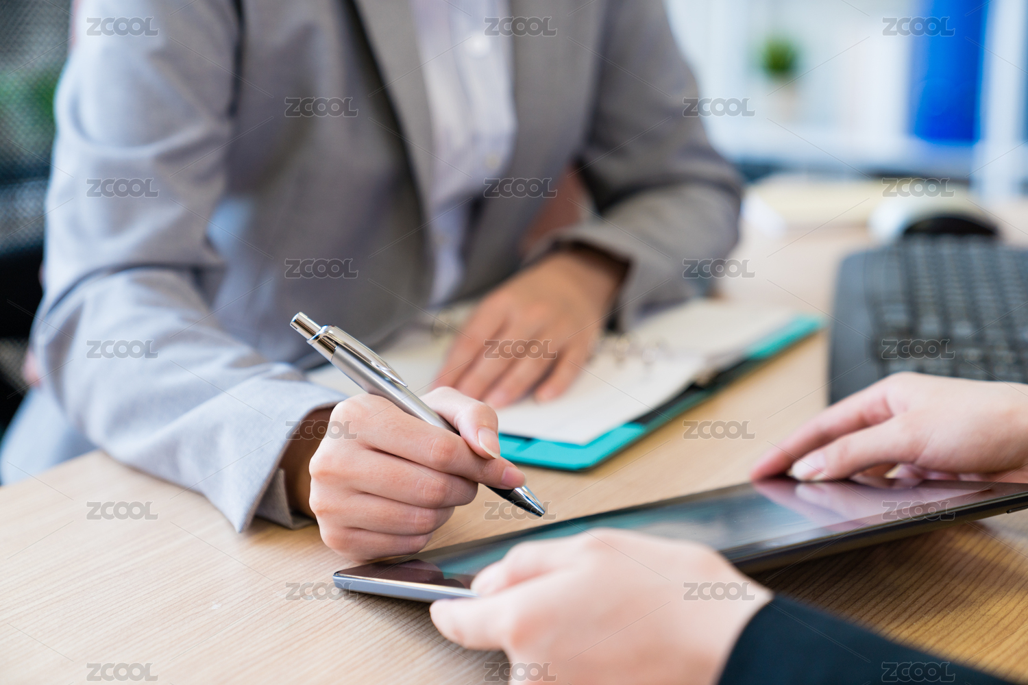 使用在办公室的平板电脑两个业务的女士。他们正在讨论商业的东西。他们都穿着正装。