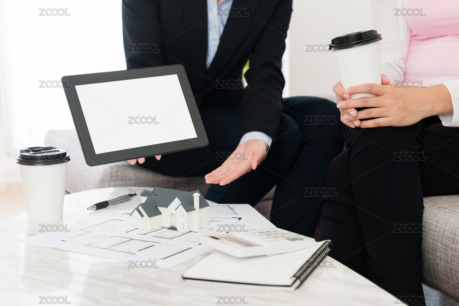 女商人展示了客户解释的建筑设计和使用移动平板计算机显示文档空白屏幕的房子模型。