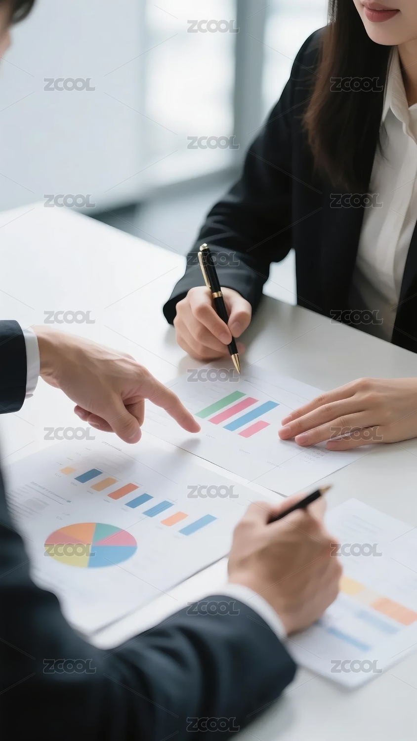 年轻漂亮的女人经理介绍公司为了获得客户的信任市场分析报告文件,她的合作伙伴的情况下。
