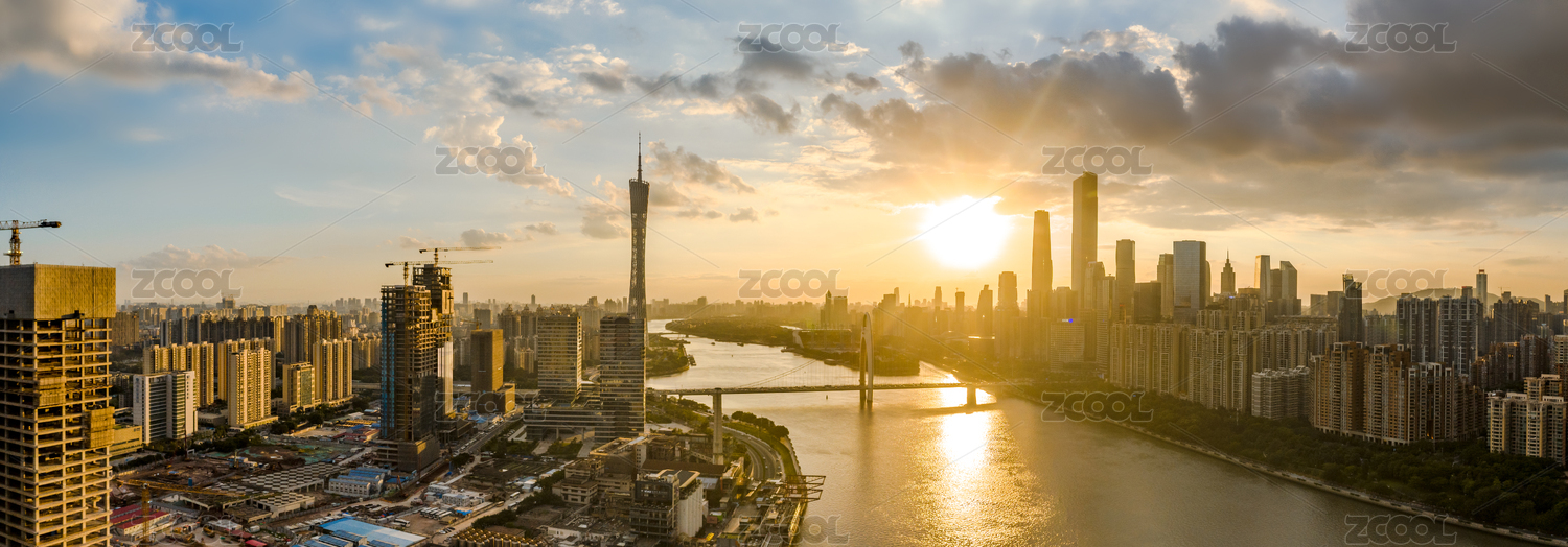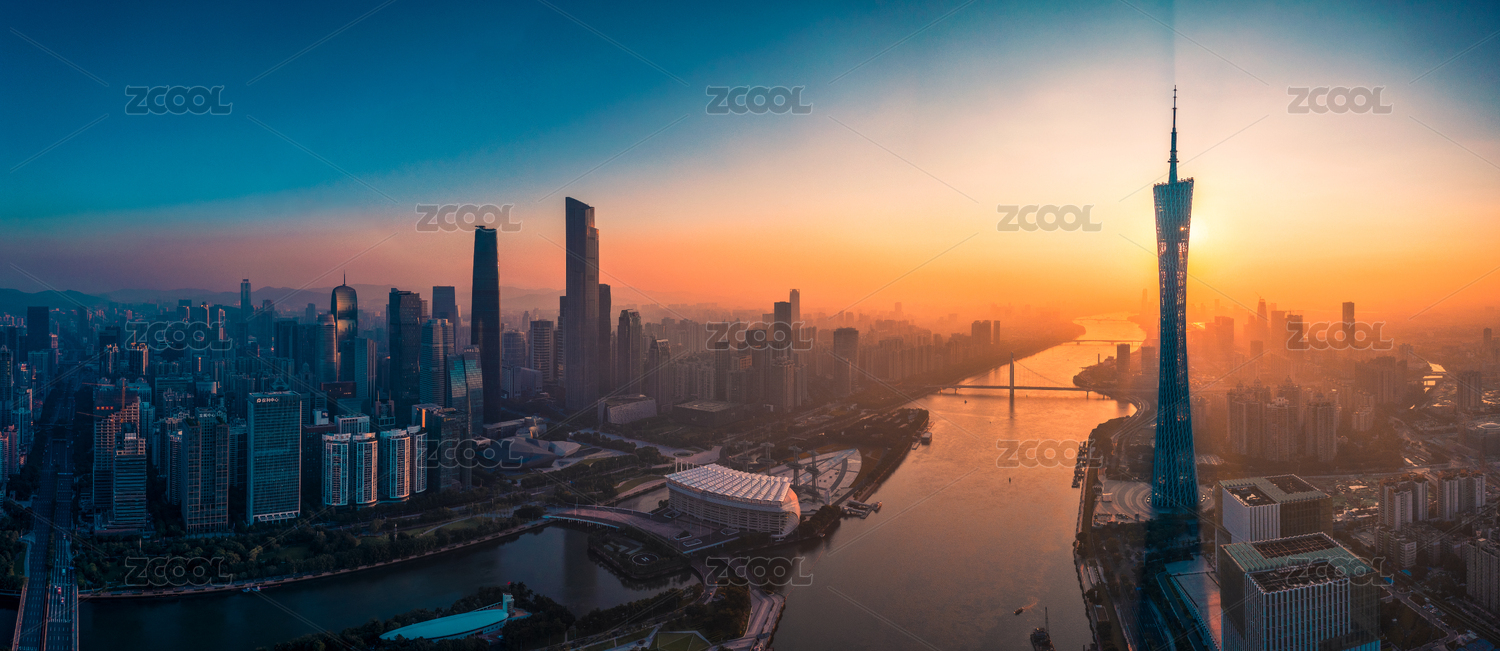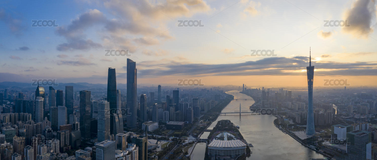 黄昏下的广州珠江新城琶洲CBD建筑群航拍