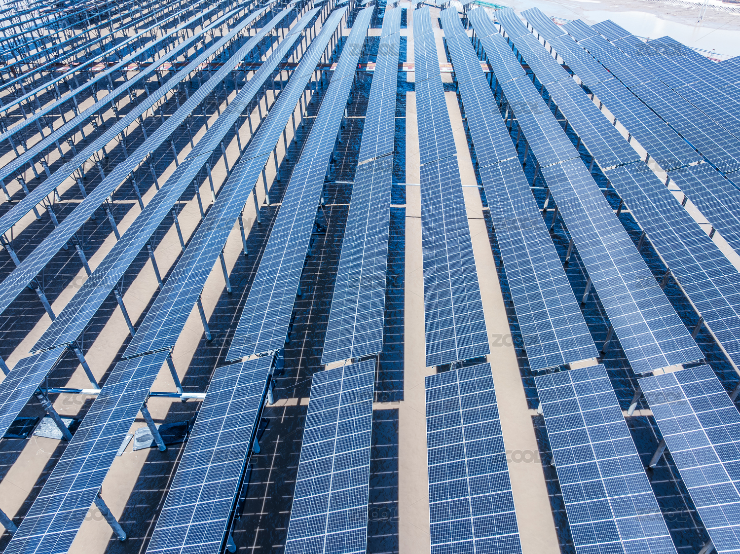 航拍安装在蔬菜大棚屋顶的太阳能光伏