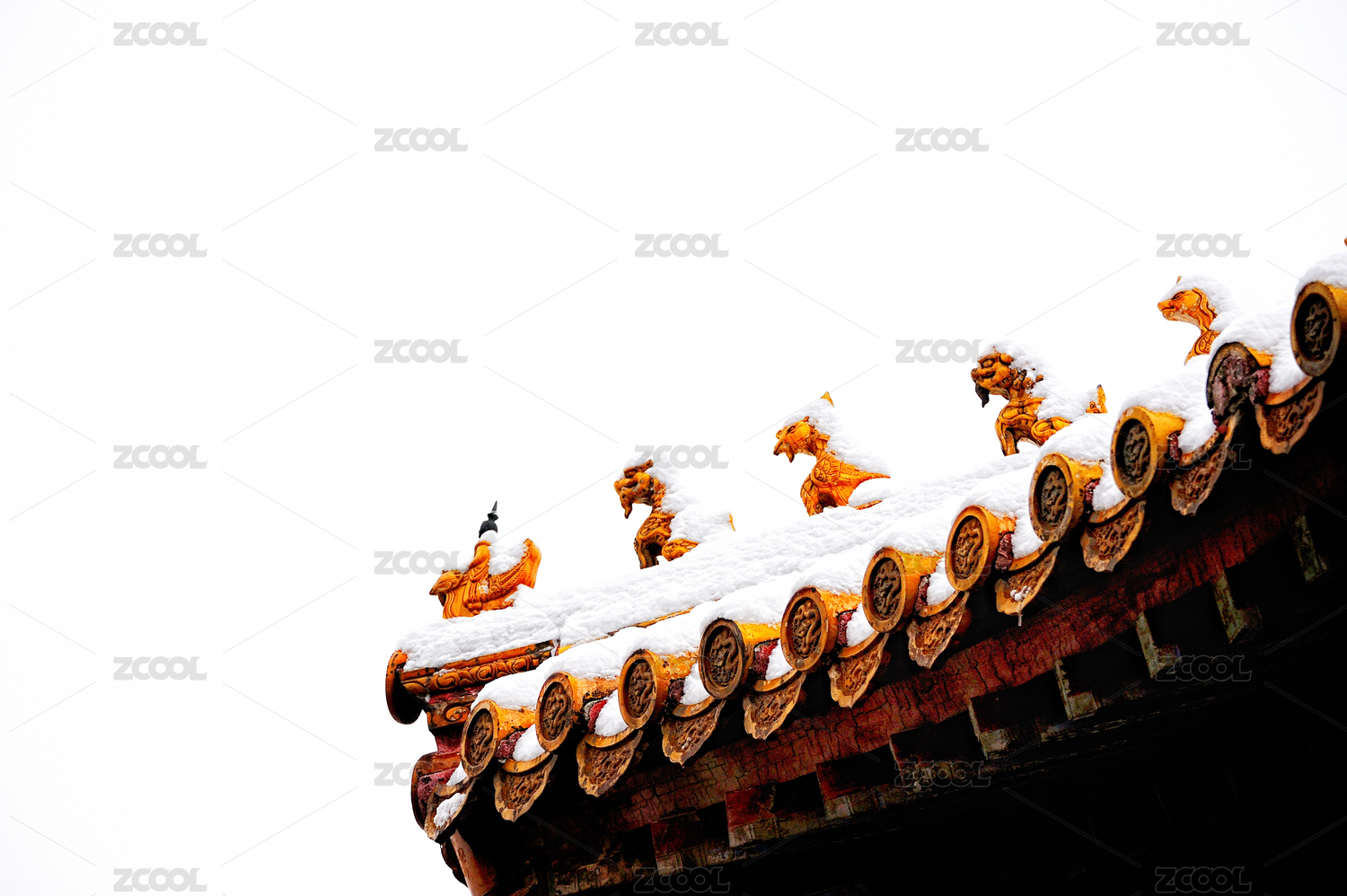 雪后故宫宫殿上的金色琉璃瓦及鸱吻和脊兽