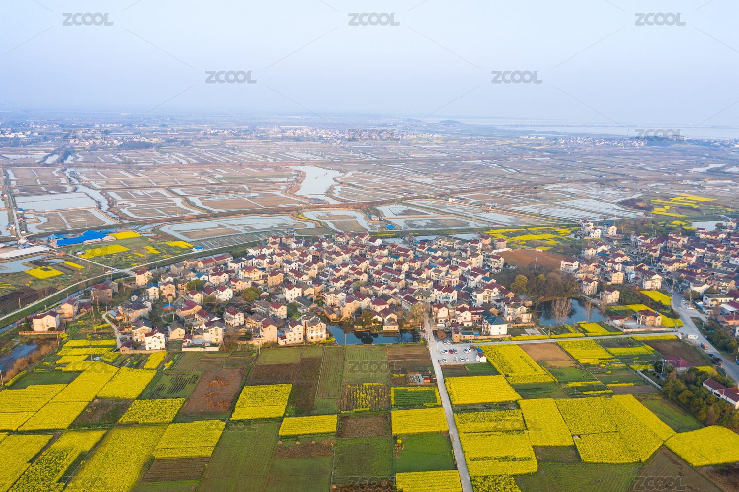 航拍江苏南京星罗棋布黄色花田中的水乡村落