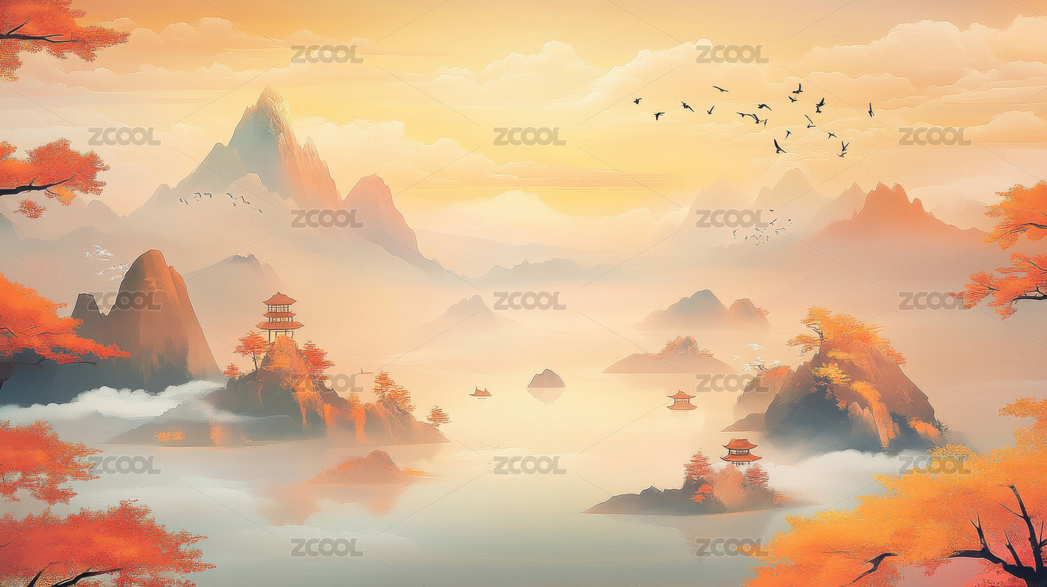 白鸽,背景,插画,插图,朝阳,国潮,国风,国庆,海报,河流