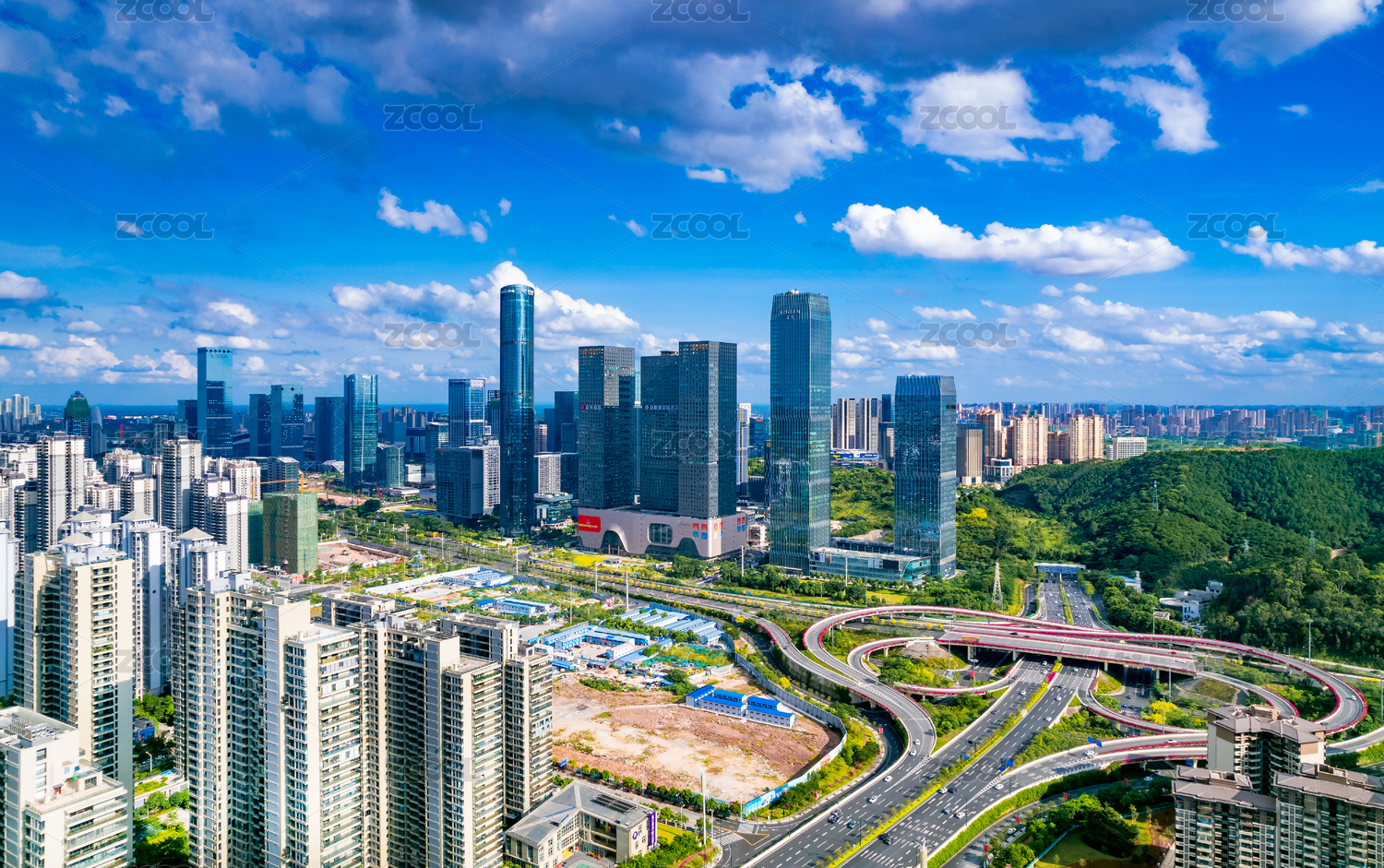 蓝天白云下的中国深圳市郊区住宅建筑及高架桥风光