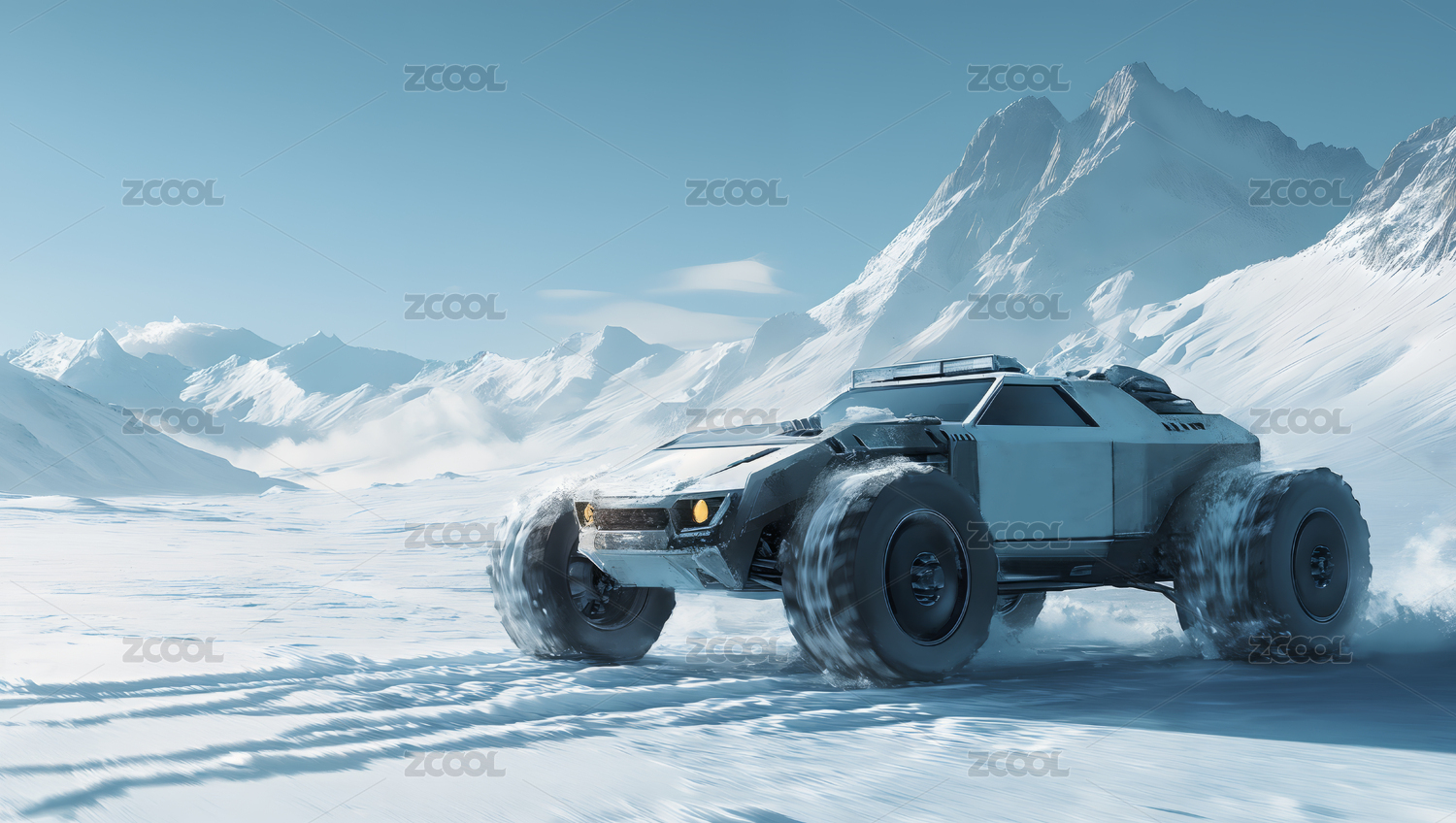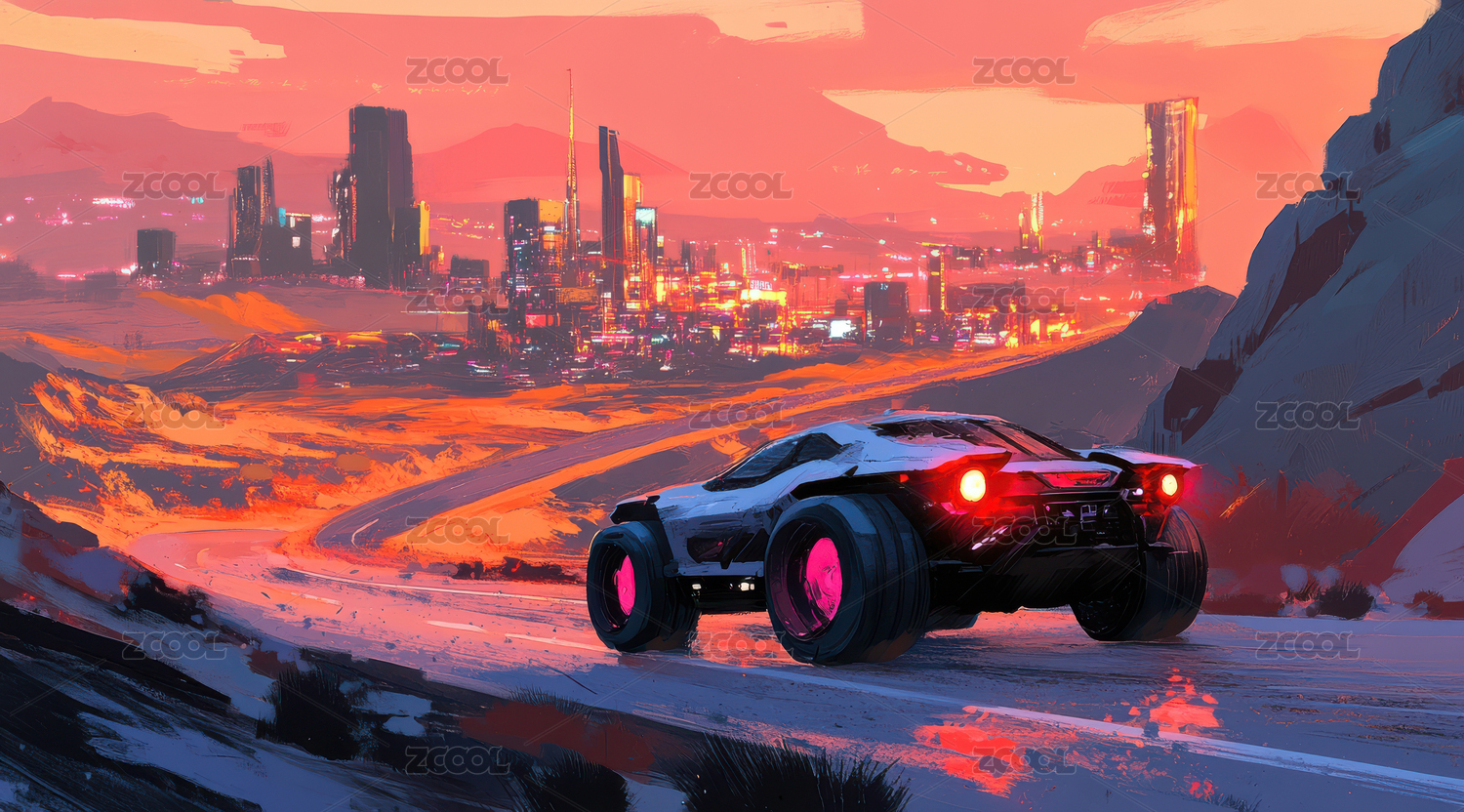 赛博朋克未来汽车沿着公路驶向远处的城市