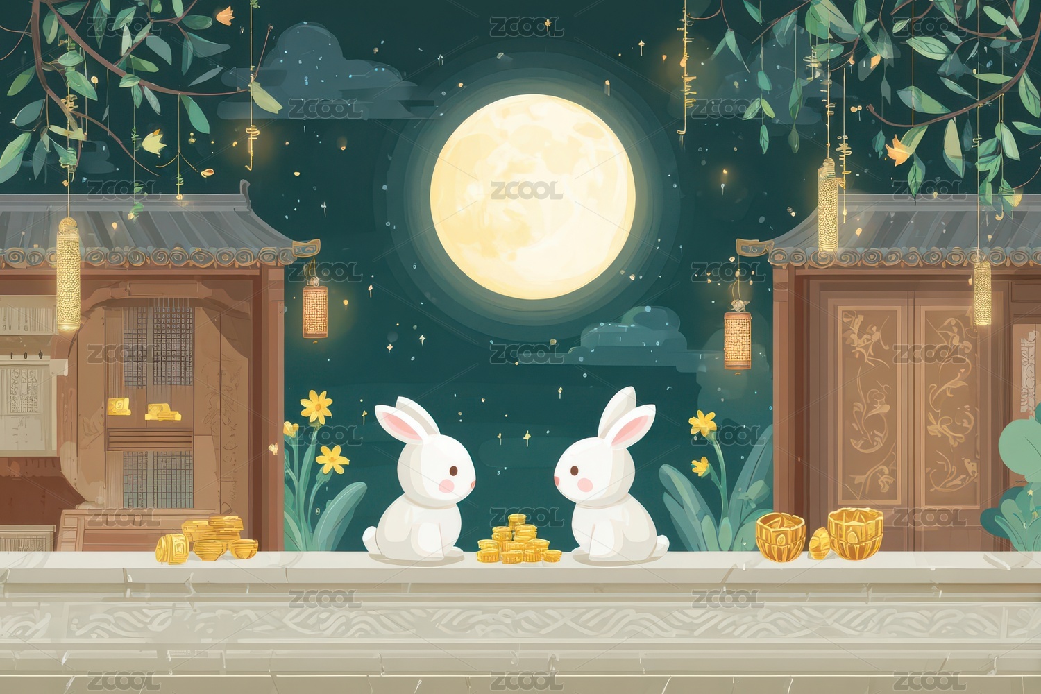 可爱的兔子抱着月饼中秋节节日庆典国潮插画