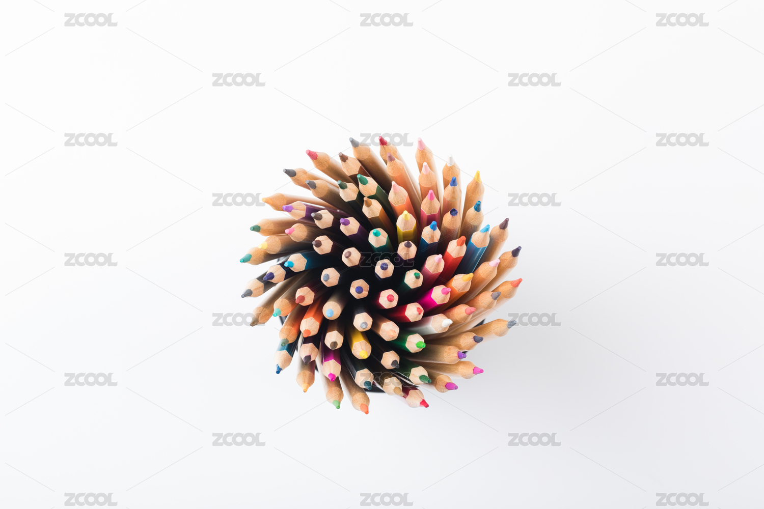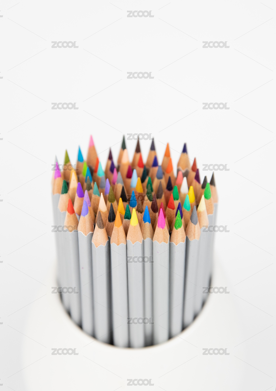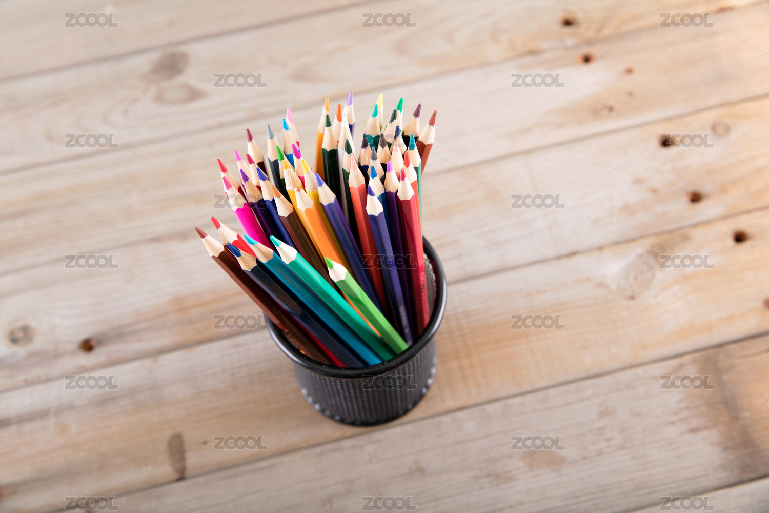松木纹桌面上黑笔筒里的十二色彩色铅笔