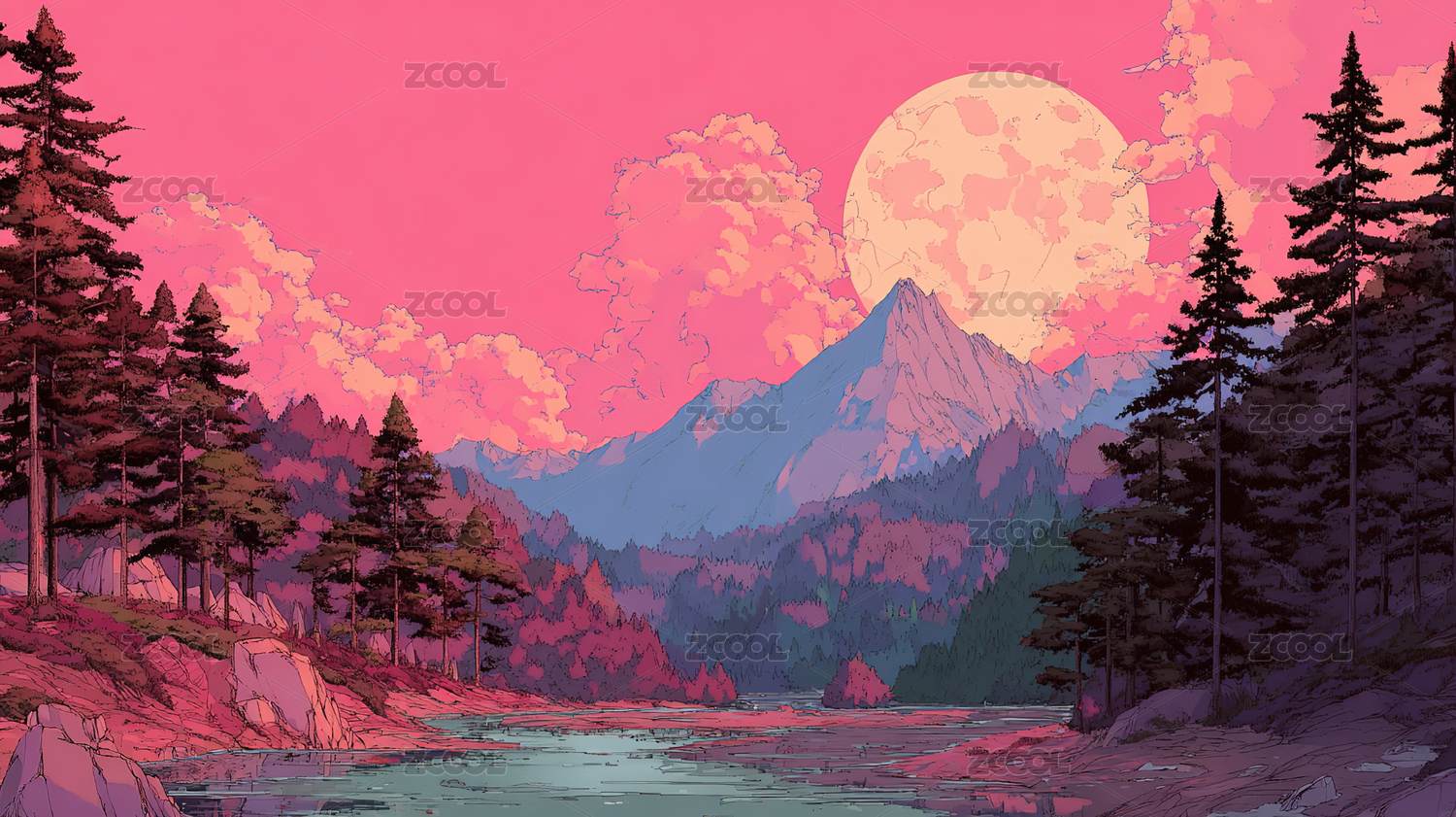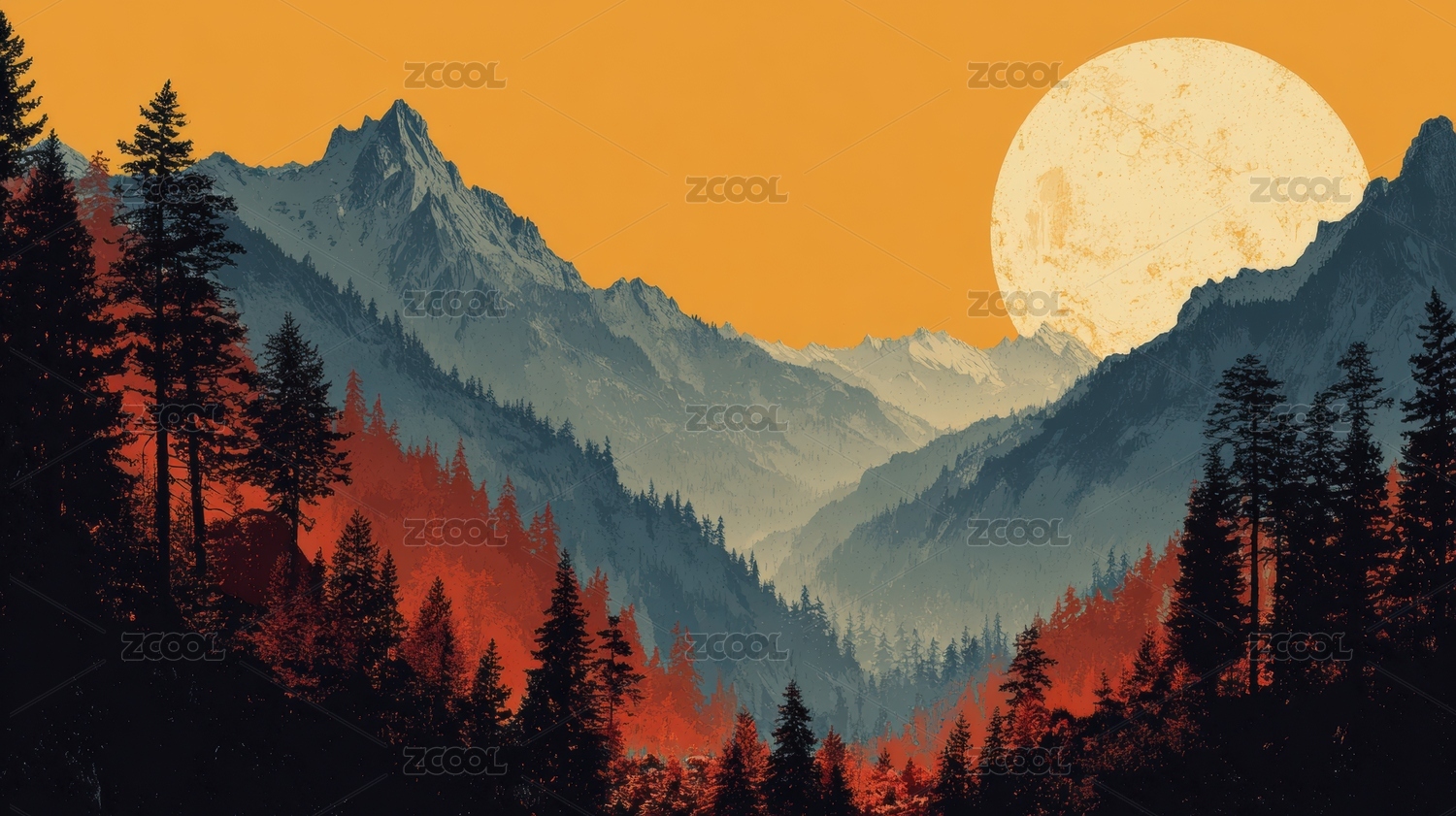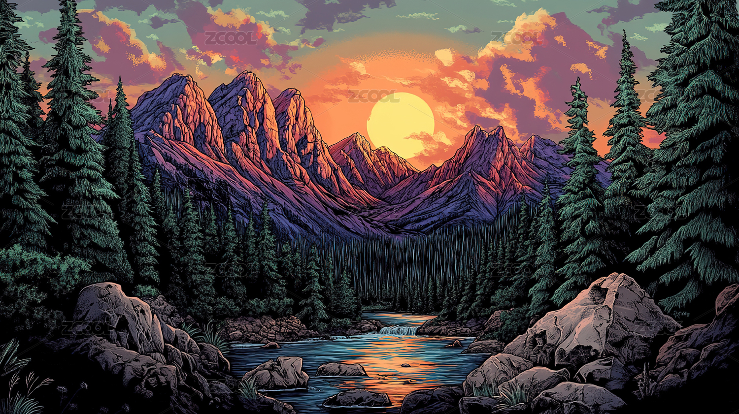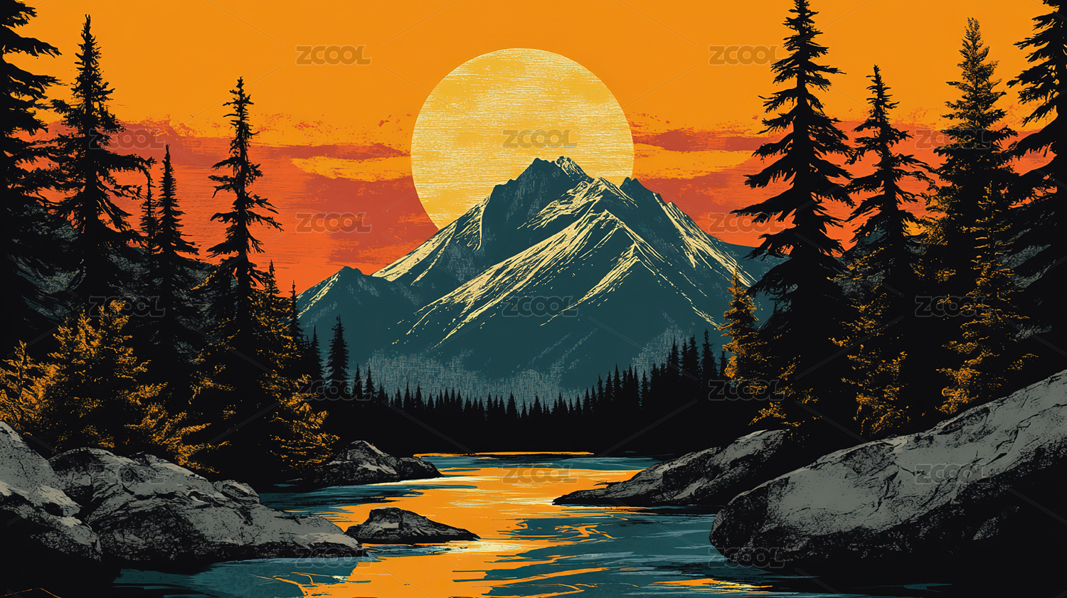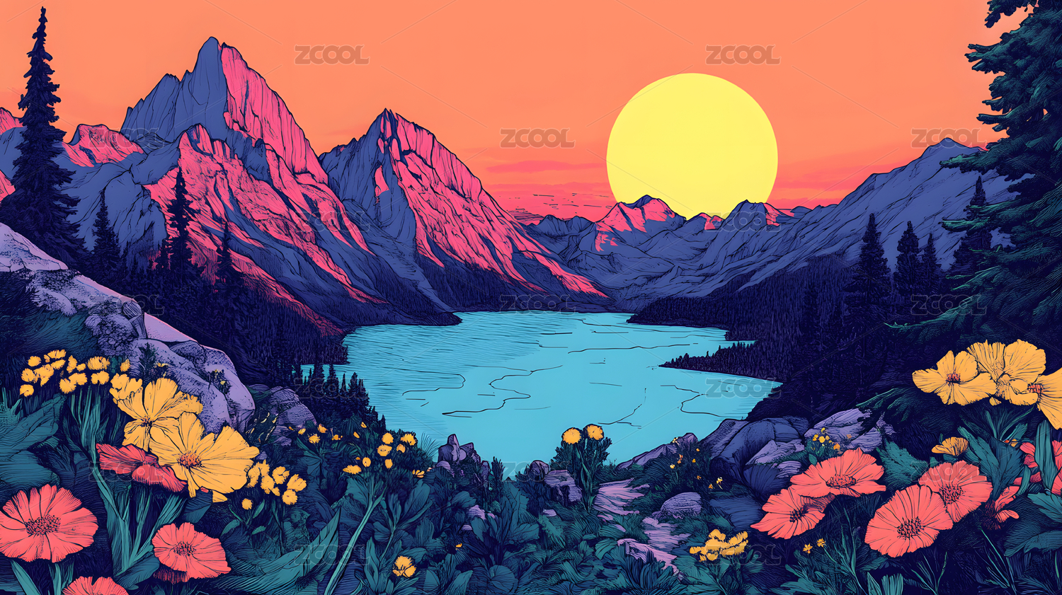 自然美,高山,户外,插画,天空,日落,云,旅游,地形
