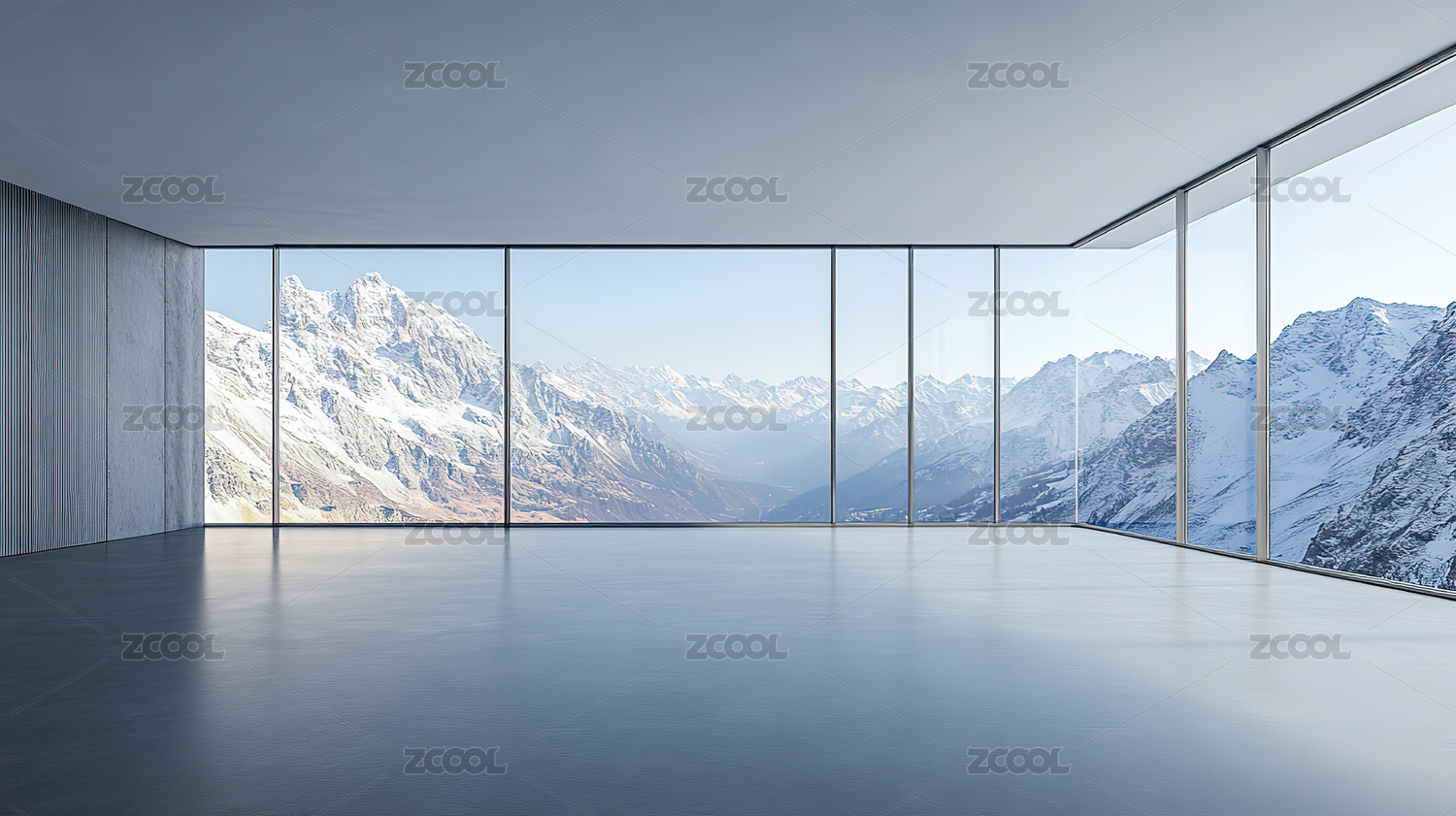 现代建筑内部落地窗和窗外的雪山