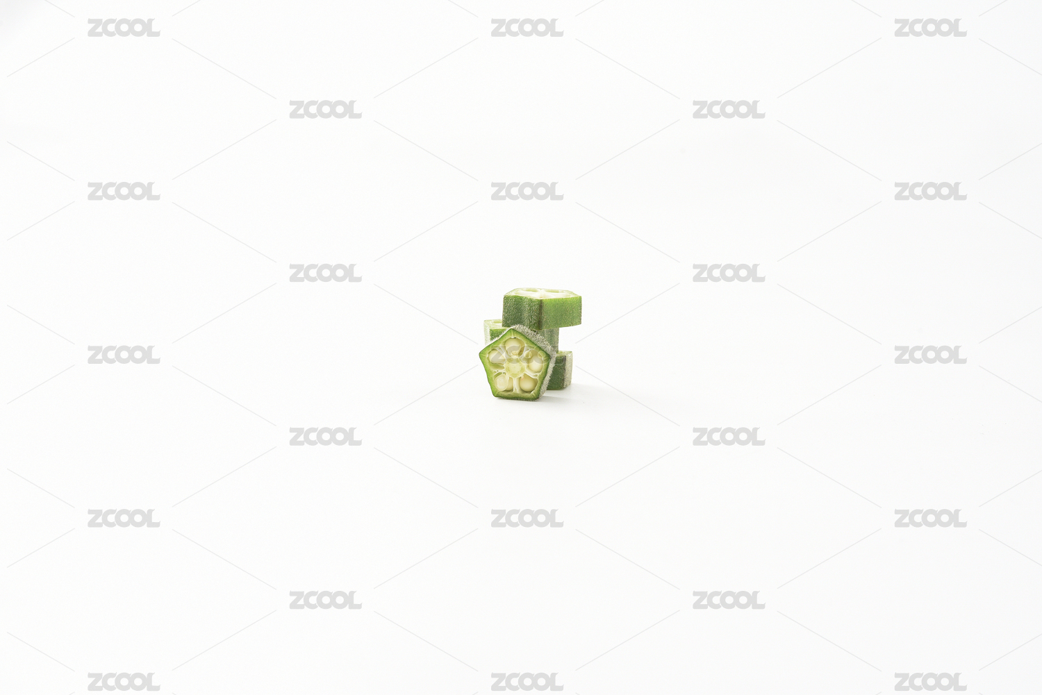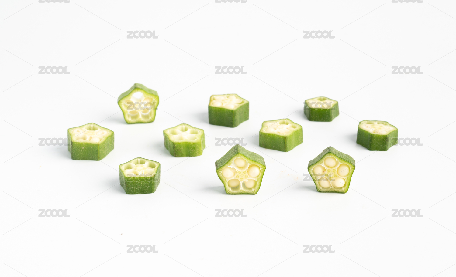 白色背景中的 新鲜嫩绿的秋葵切成片
