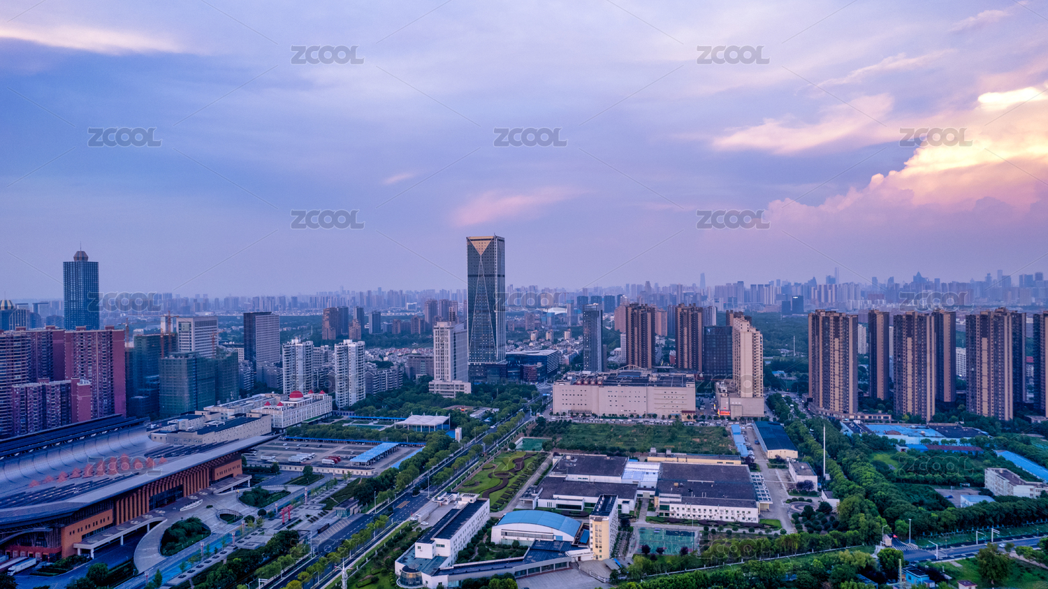 航拍傍晚暮色中郑州郑东绿地双子塔地标建筑