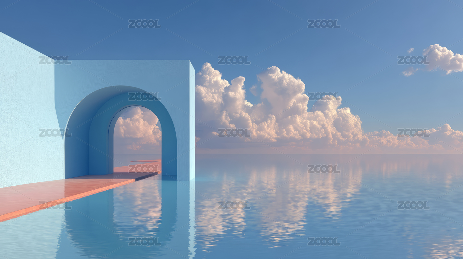 海边,现代,建筑,天空,云朵,圆柱体,黄色,墙壁,蓝色,地面