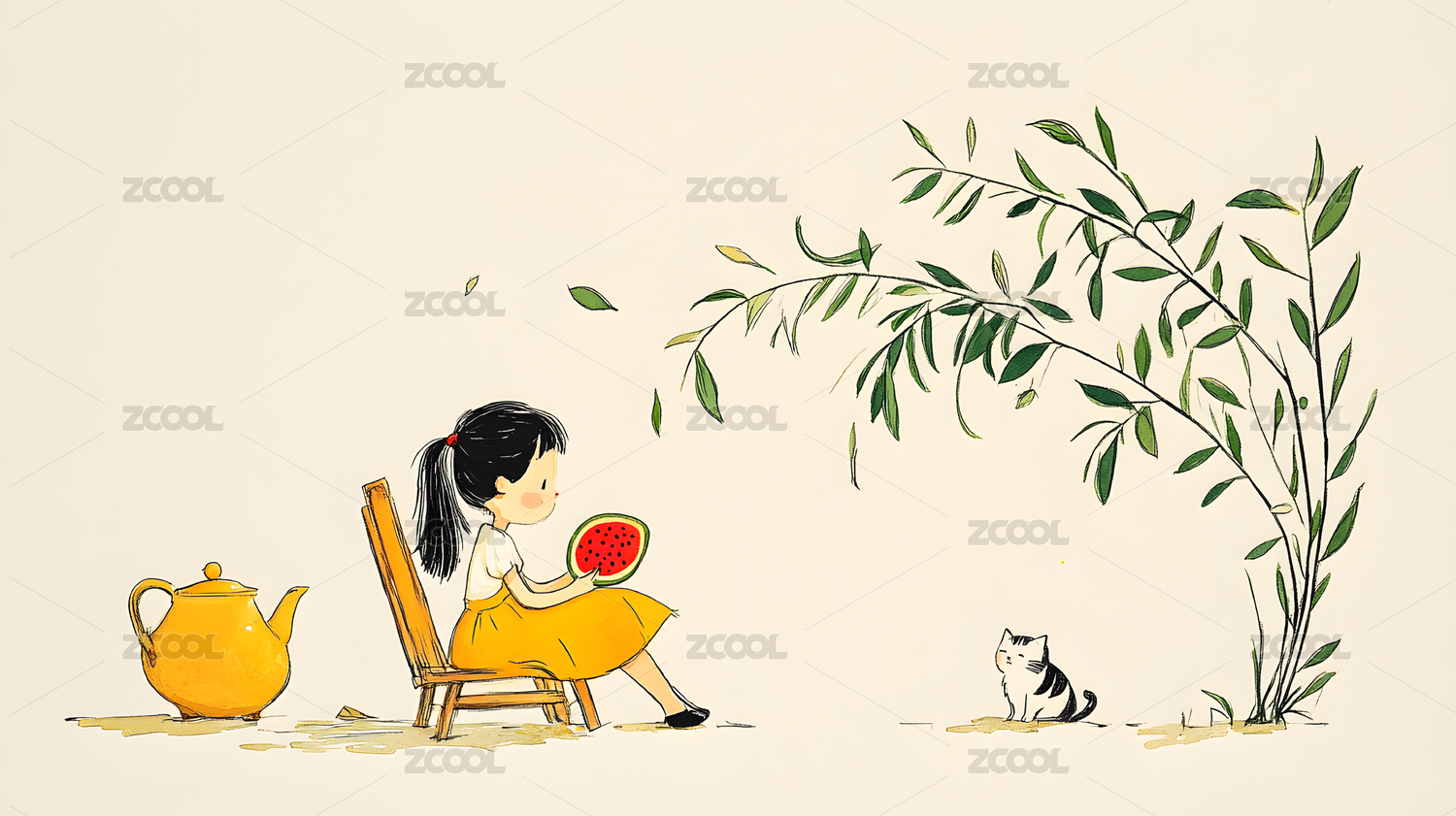 水墨风,吃西瓜,男孩,可爱,调皮,舒适,猫咪,睡觉,凉爽,夏天