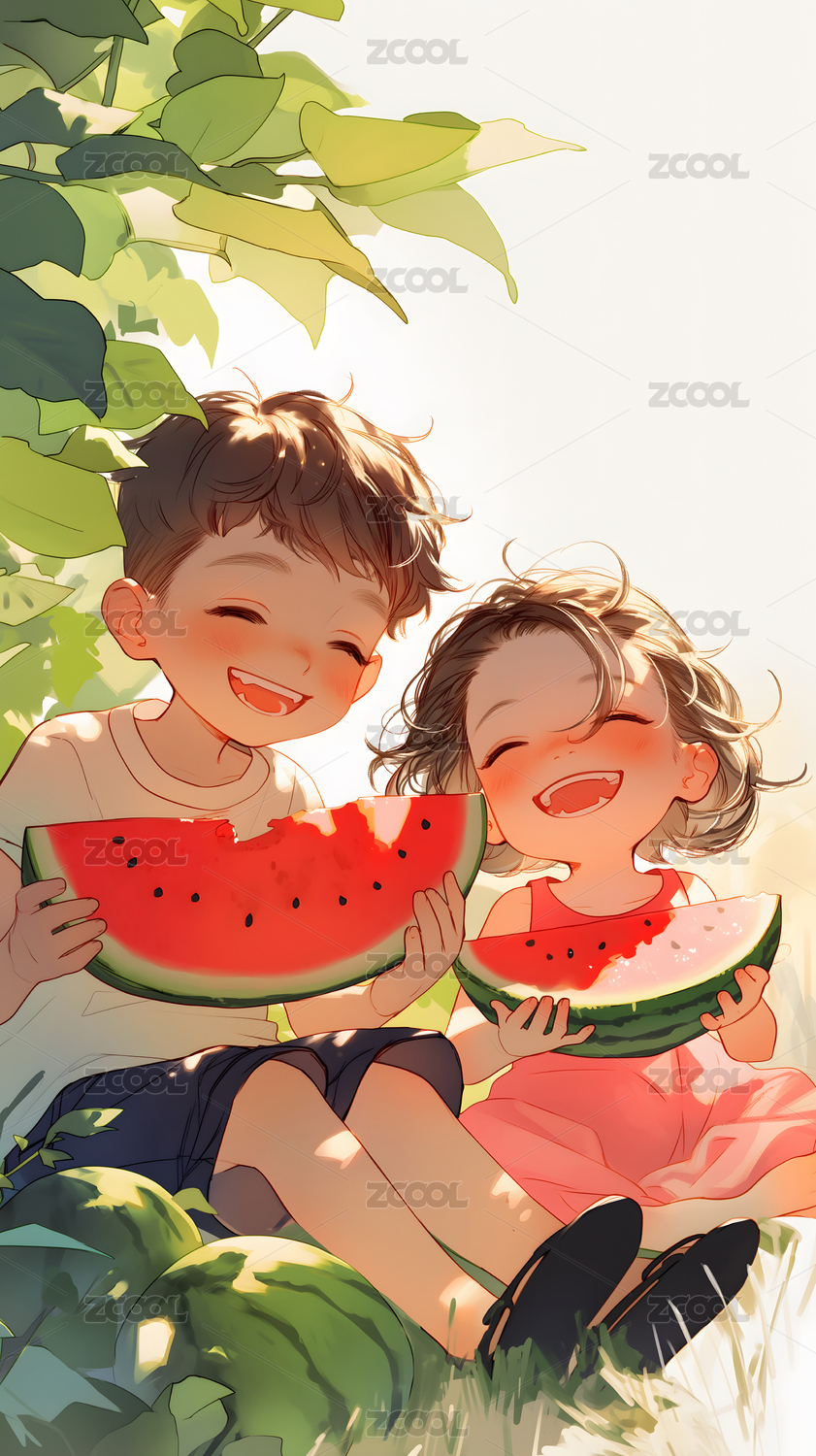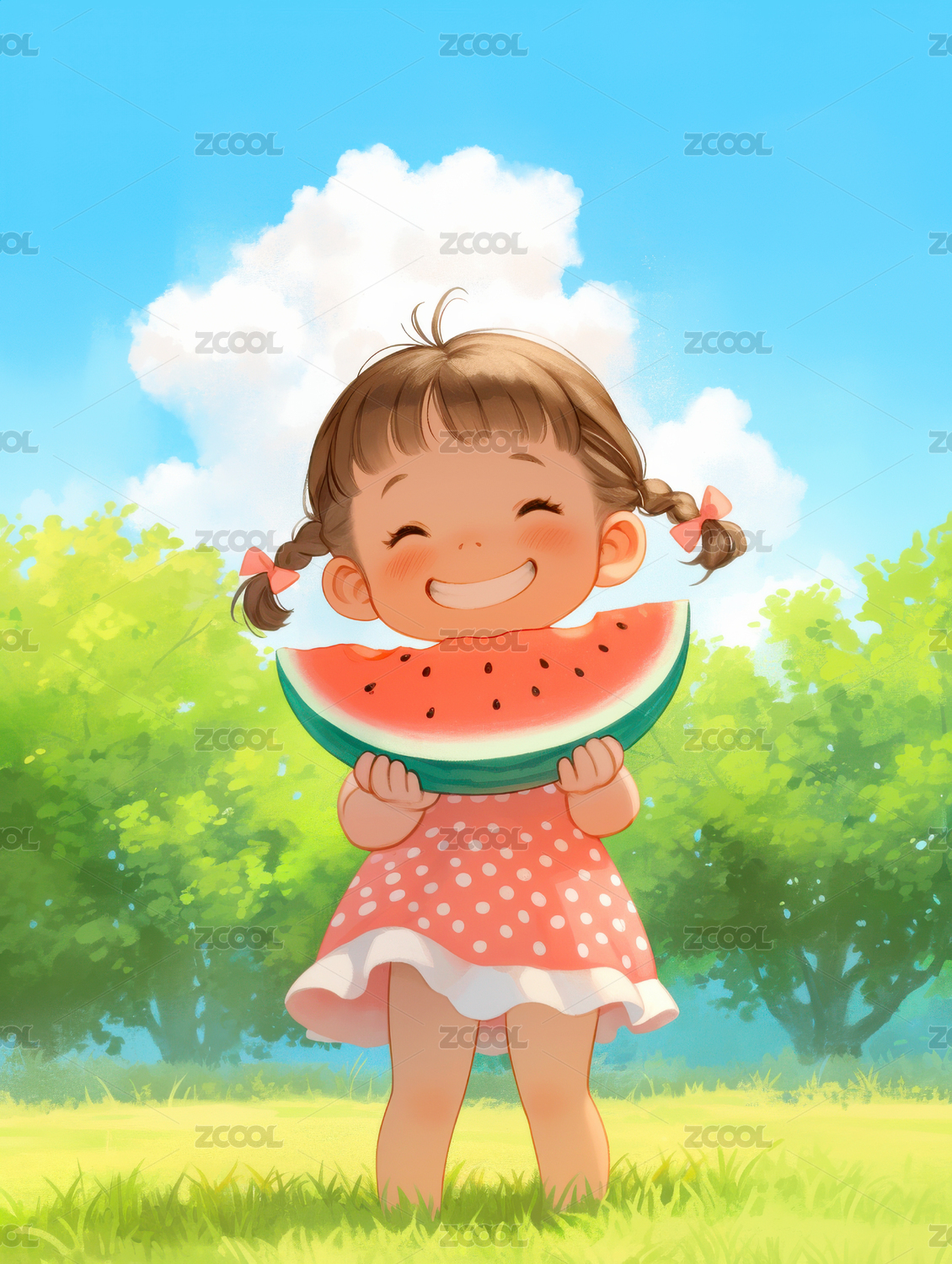 户外亚洲儿童笑着抱着西瓜吃的清新卡通插画