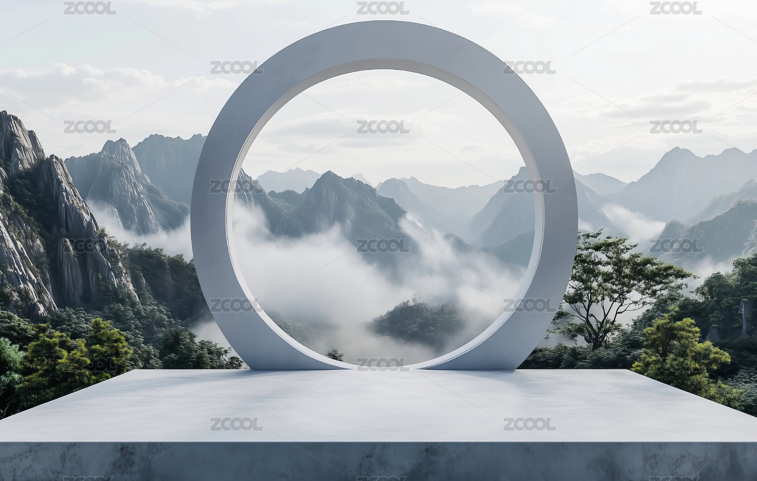 山间云雾中的圆形框架