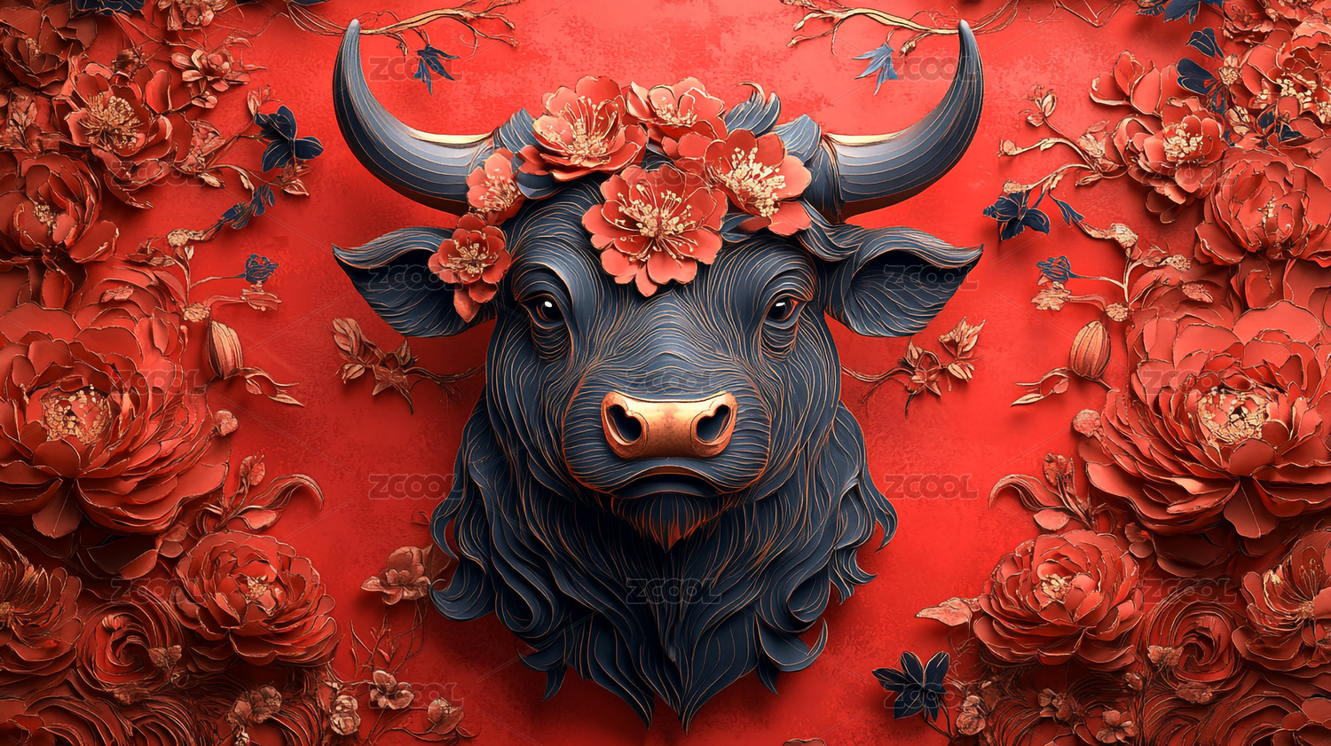 红色新年剪纸风生肖牛壁纸