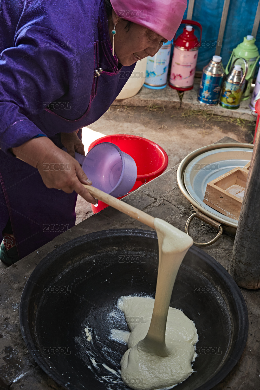 在蒙古包内用传统工艺熬煮制作奶豆腐过程