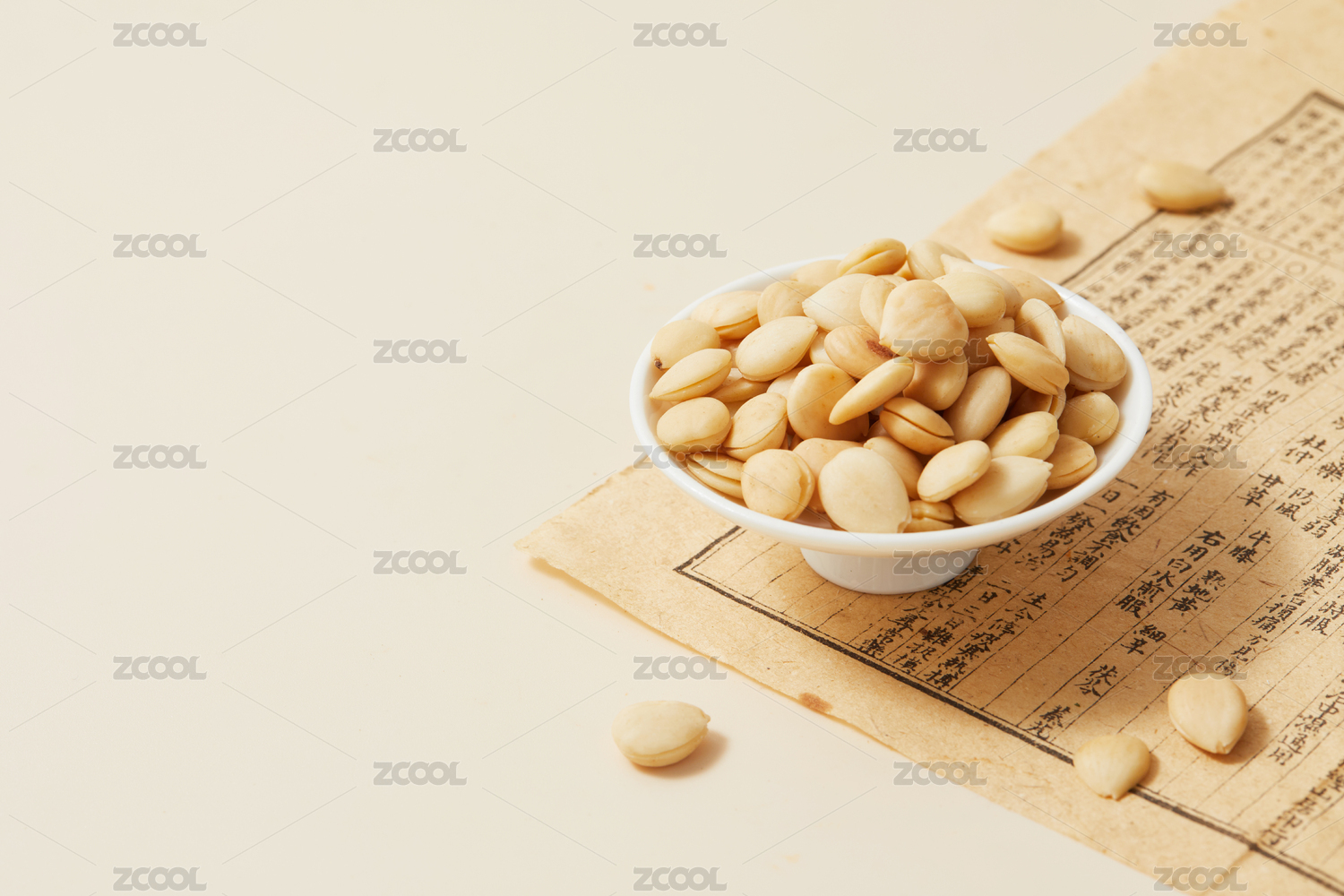 黄色背景古书上的中药材桃仁