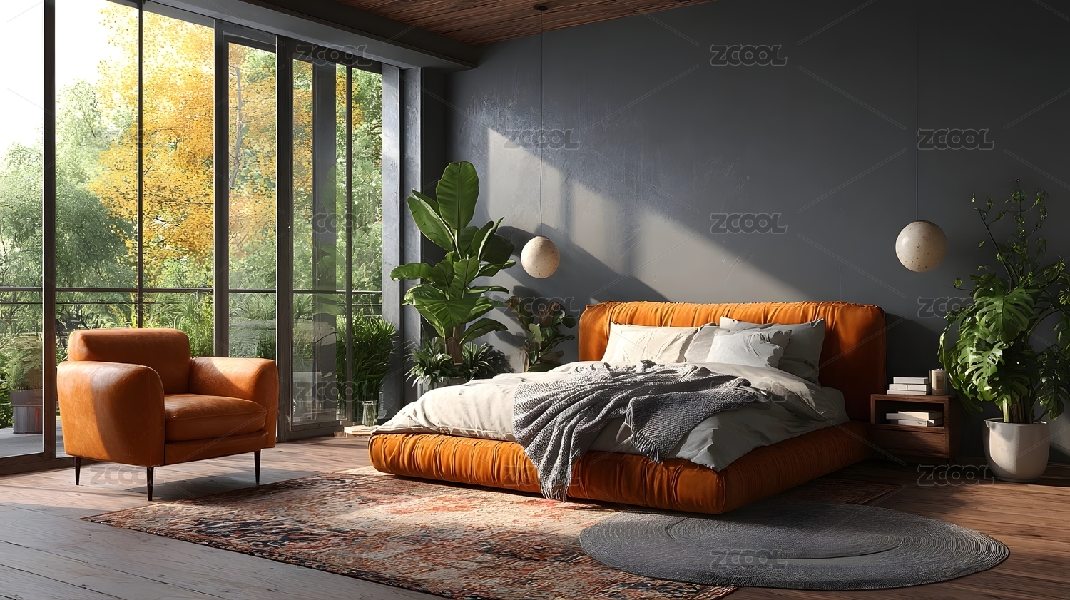现代,家居,装修,绿植,自然光,木质,简约,室内设计,落地窗,卧室