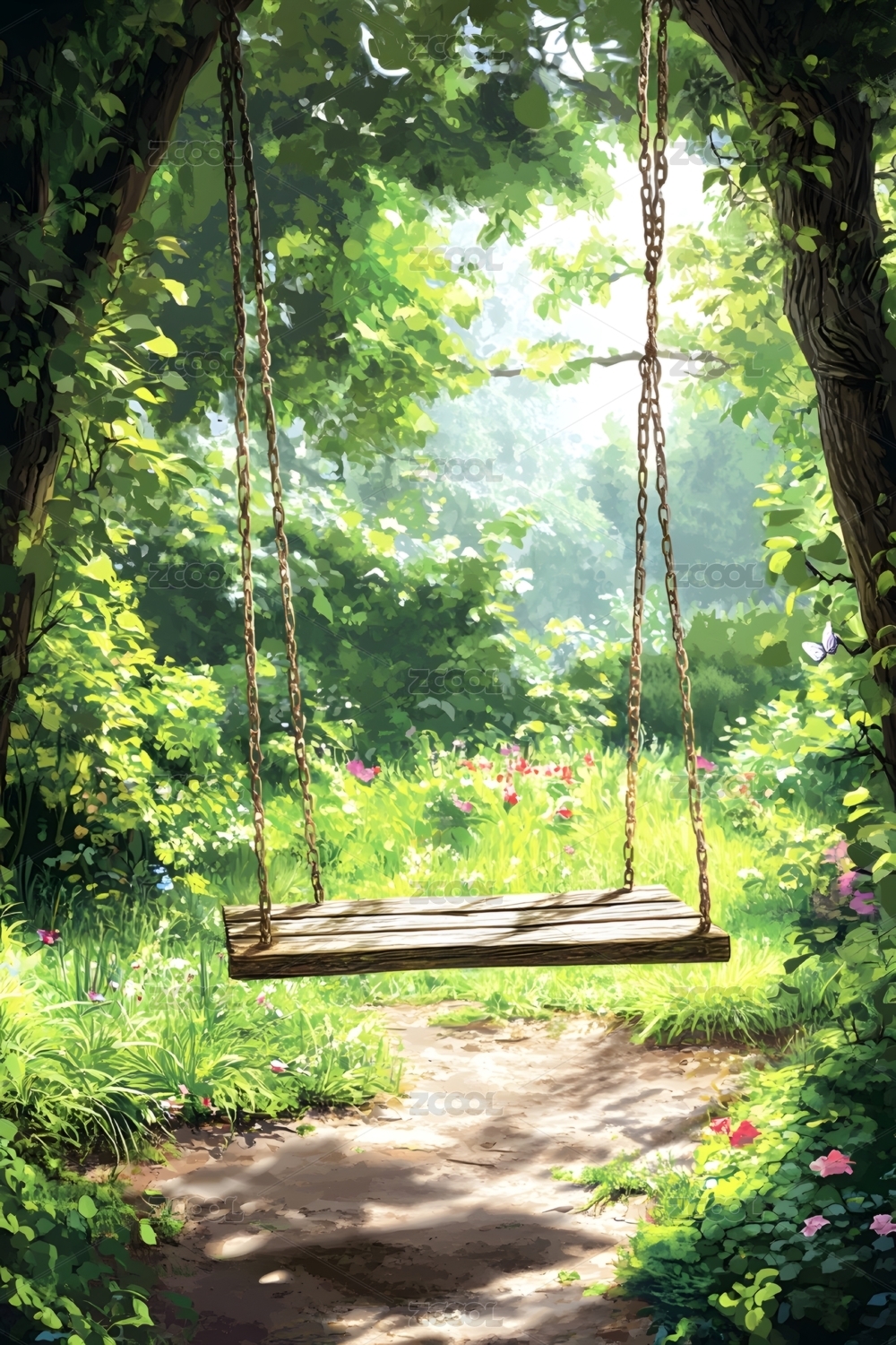 阳光洒落的森林秋千插画