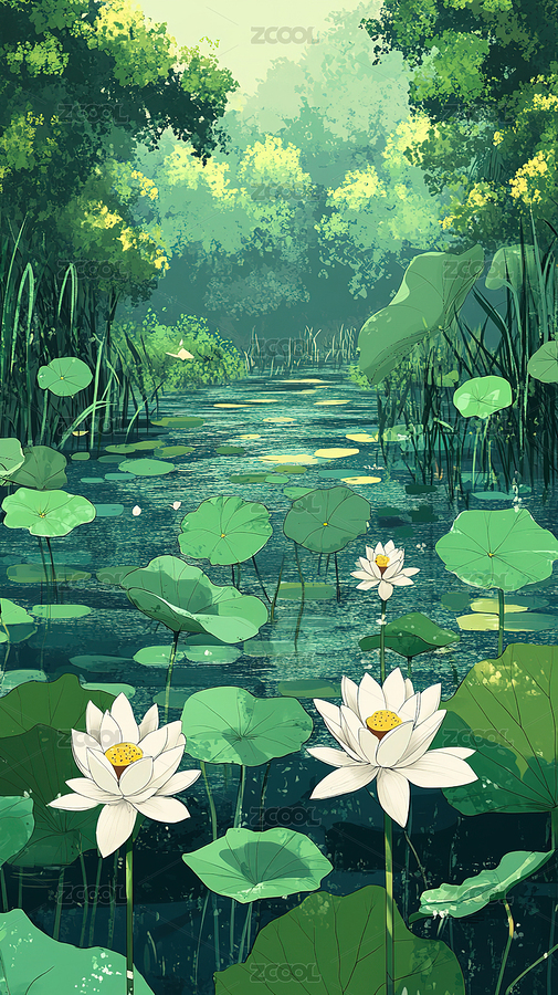 夏天清新的荷塘与荷花,日本浮世绘艺术