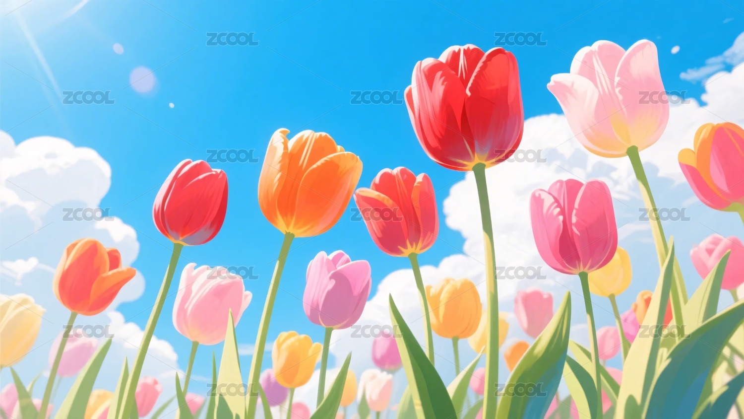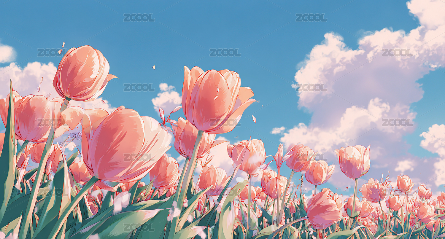 3D草地上郁金香蓝天白云