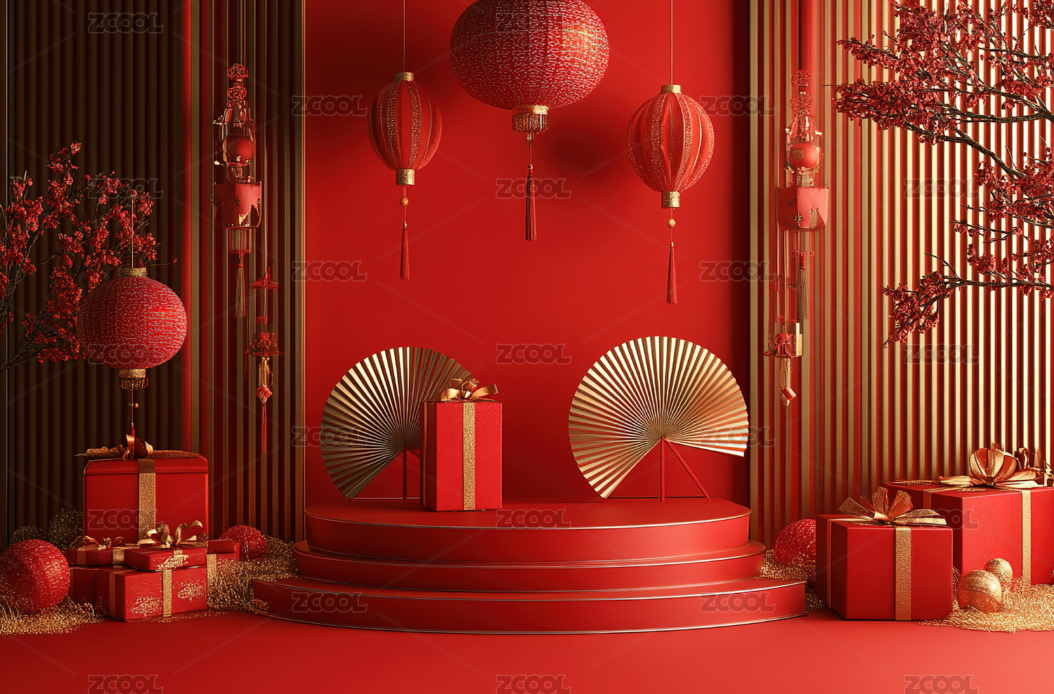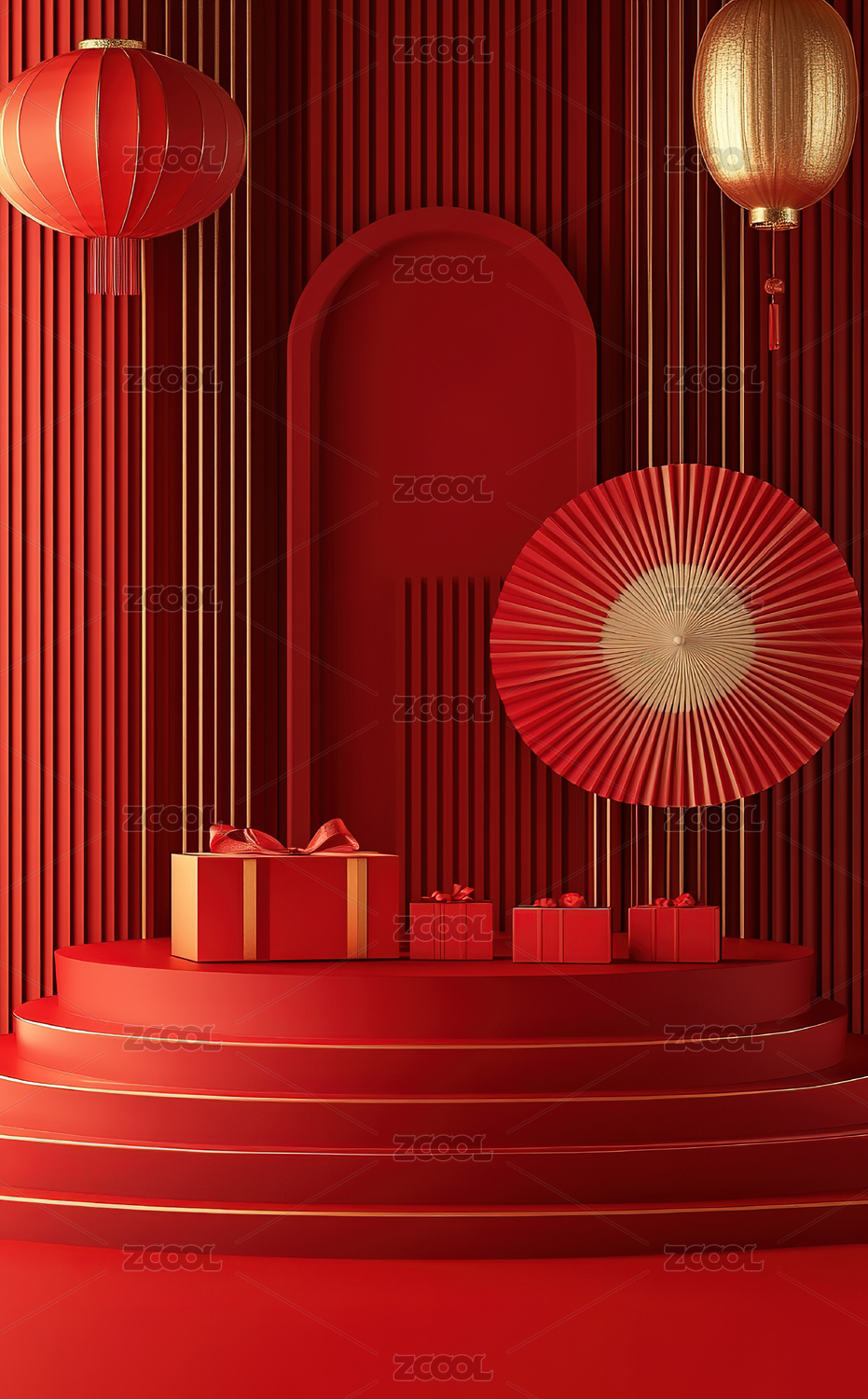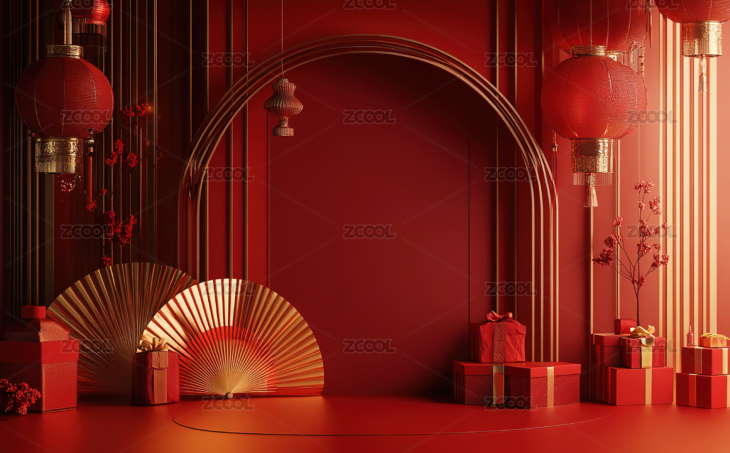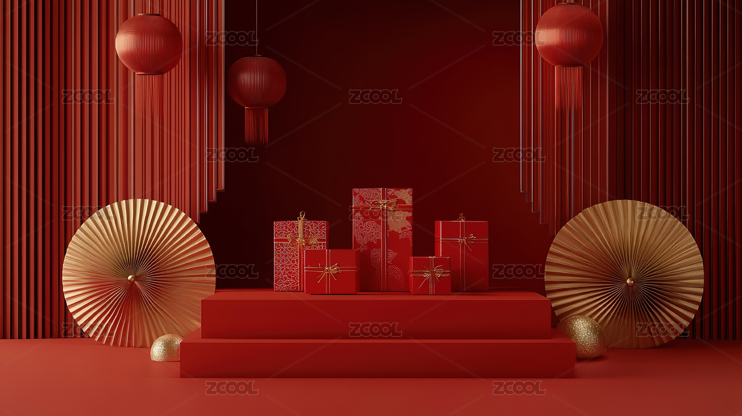 红底中式礼盒舞台场景图