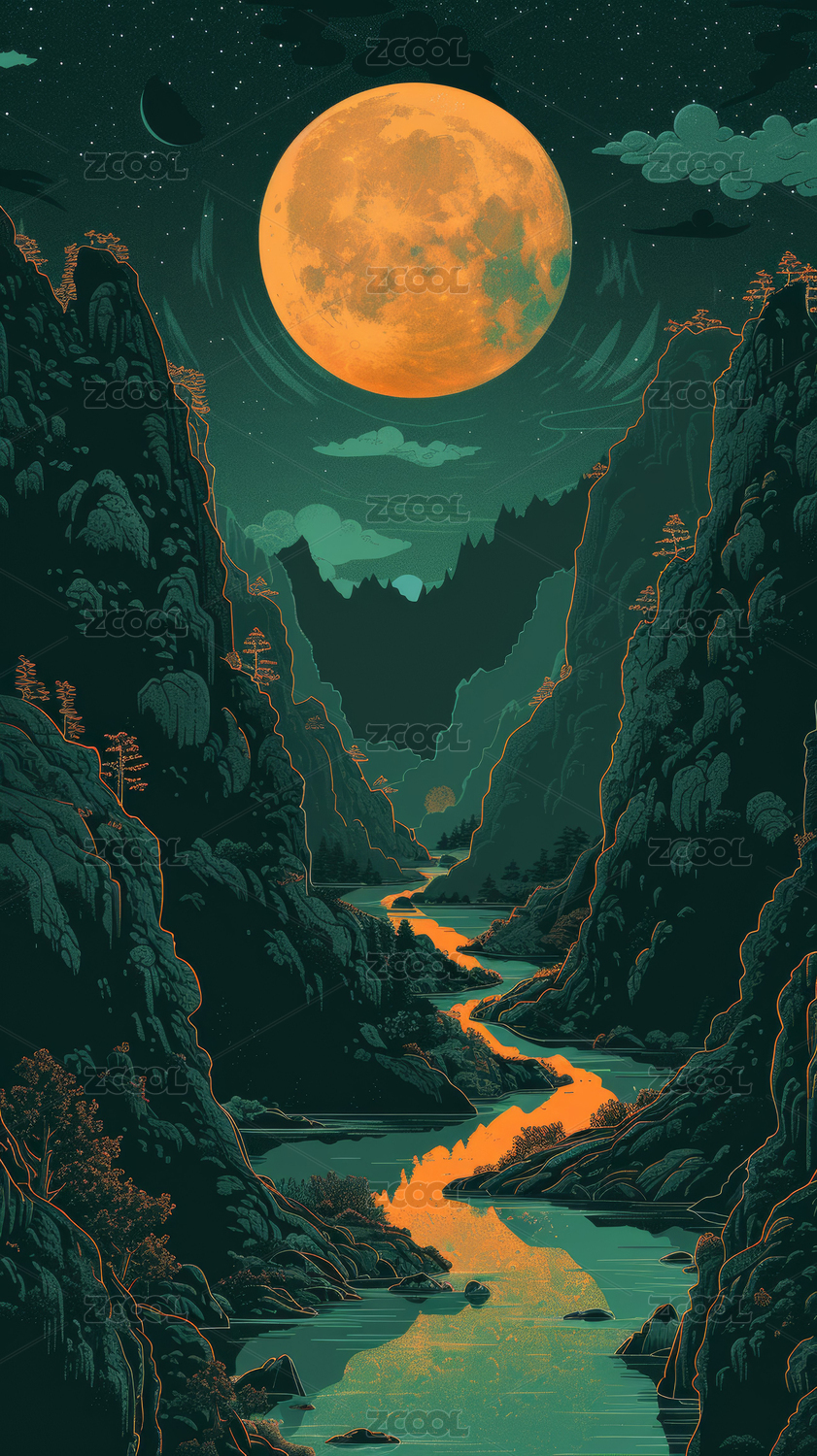 夜晚河流山川月亮