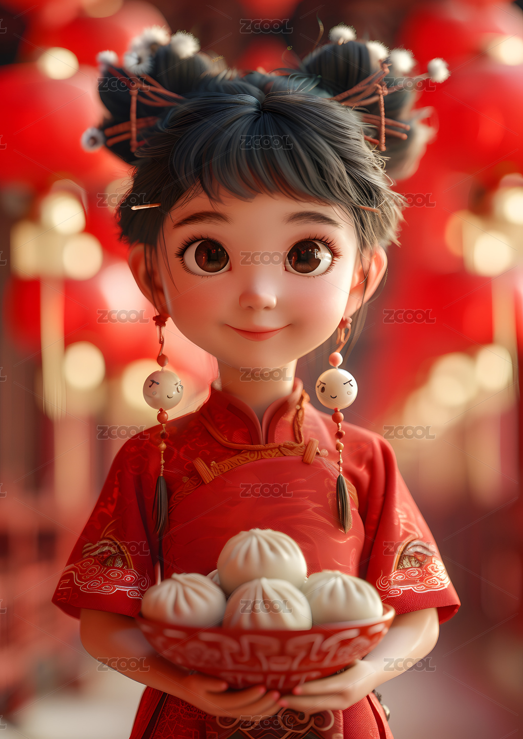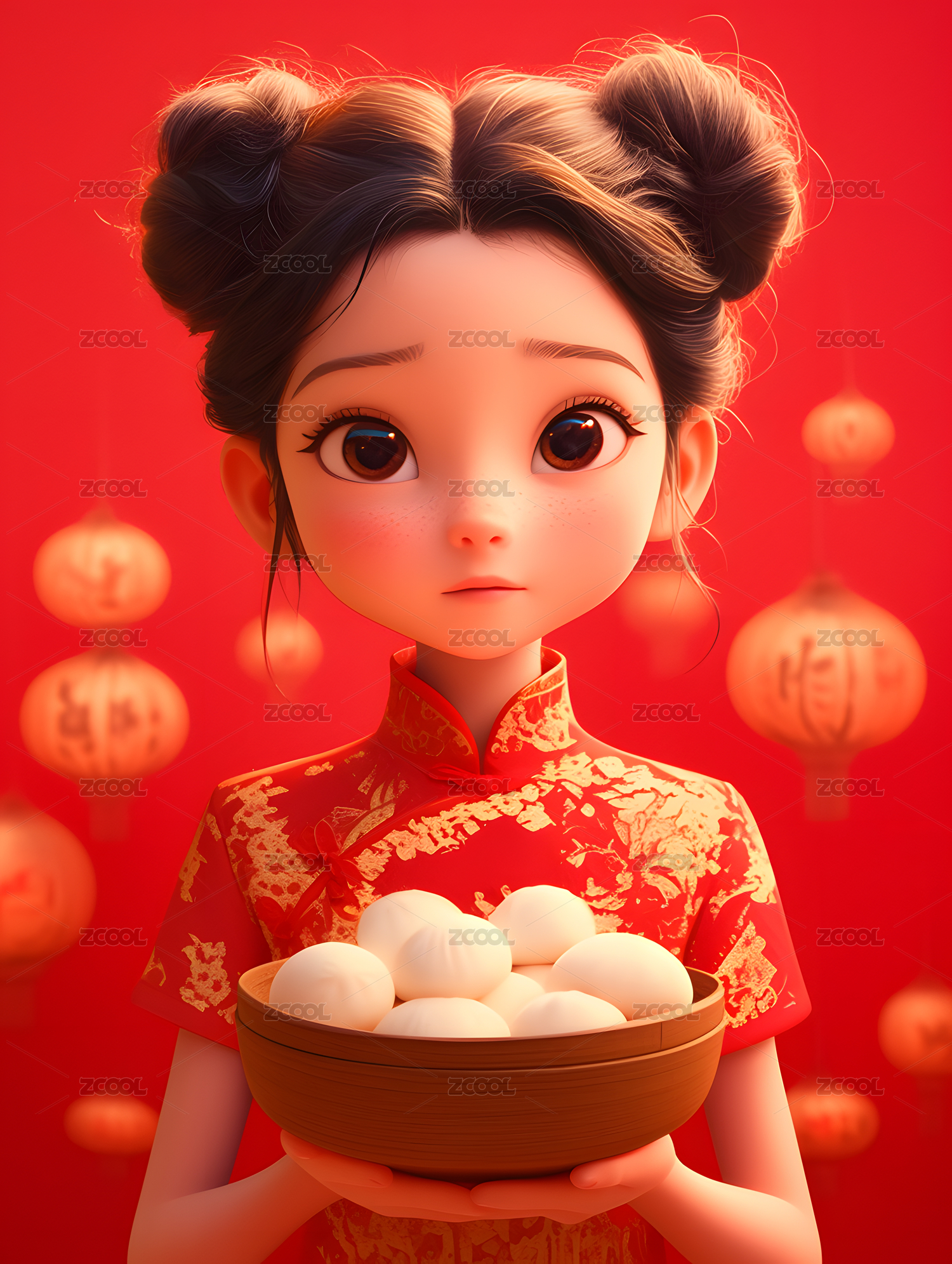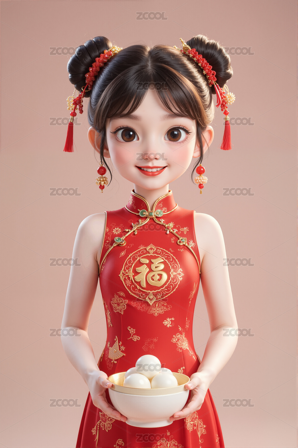 身穿无袖旗袍的少女端着元宵
