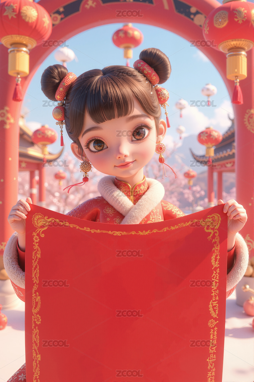 新年牌楼前站着一个手拿红色部的女孩