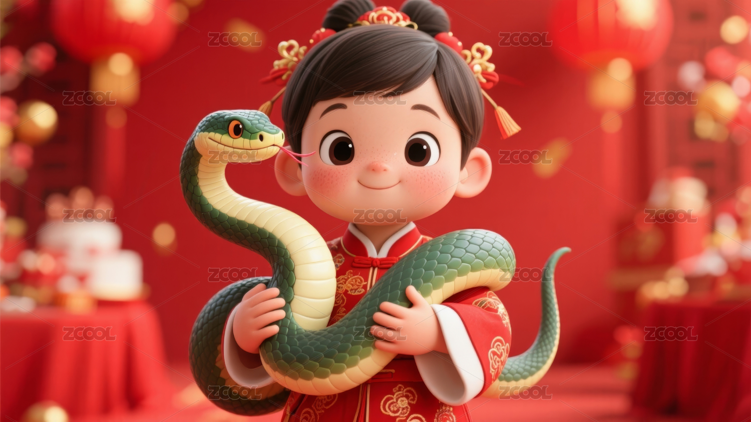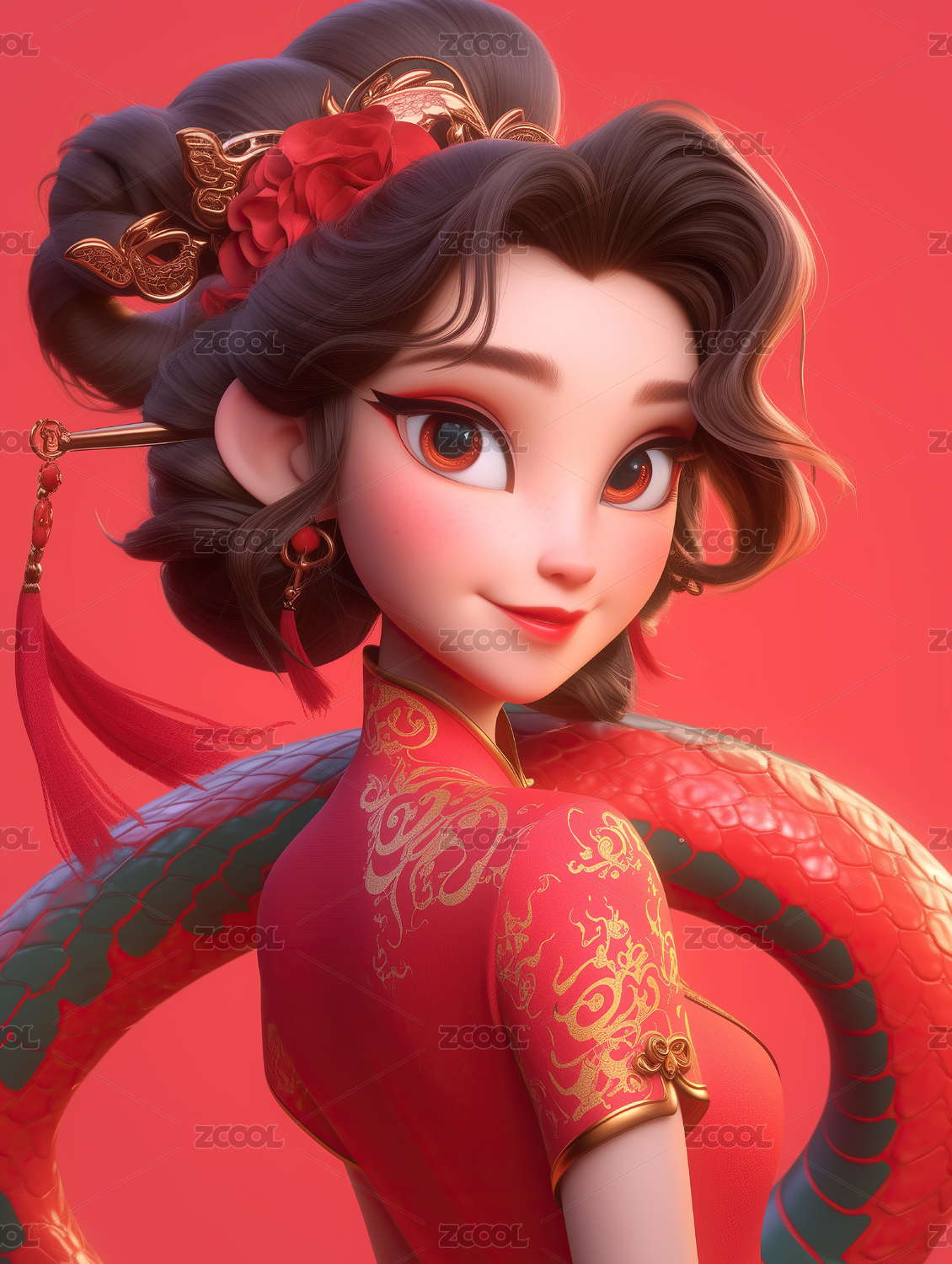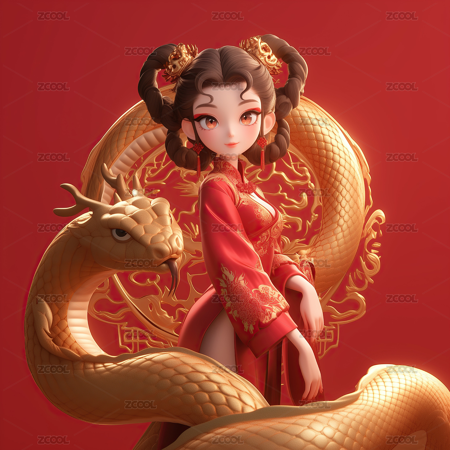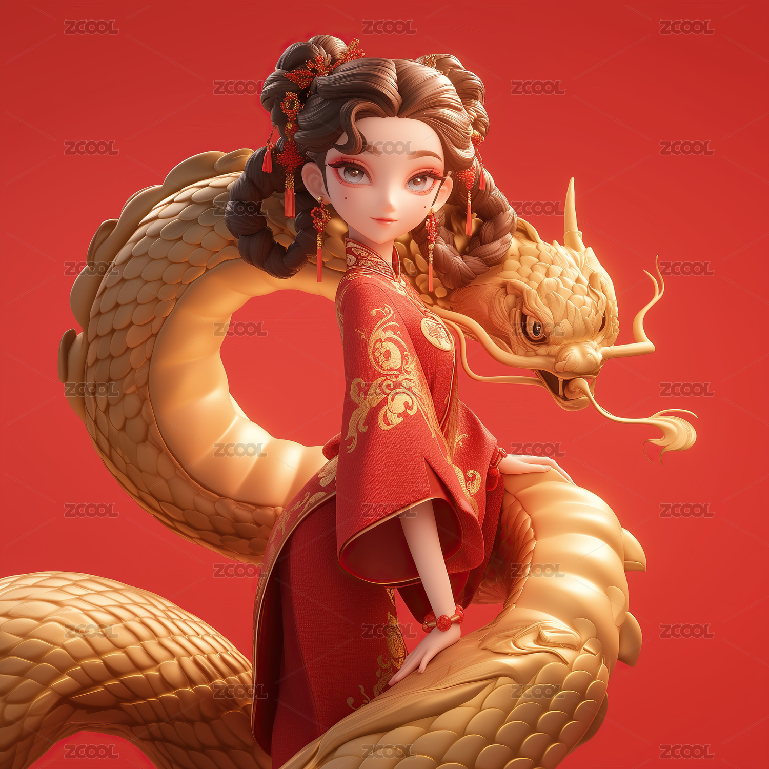 中国风,新年,女生,红色,金色蛇,雕刻,春节,古装