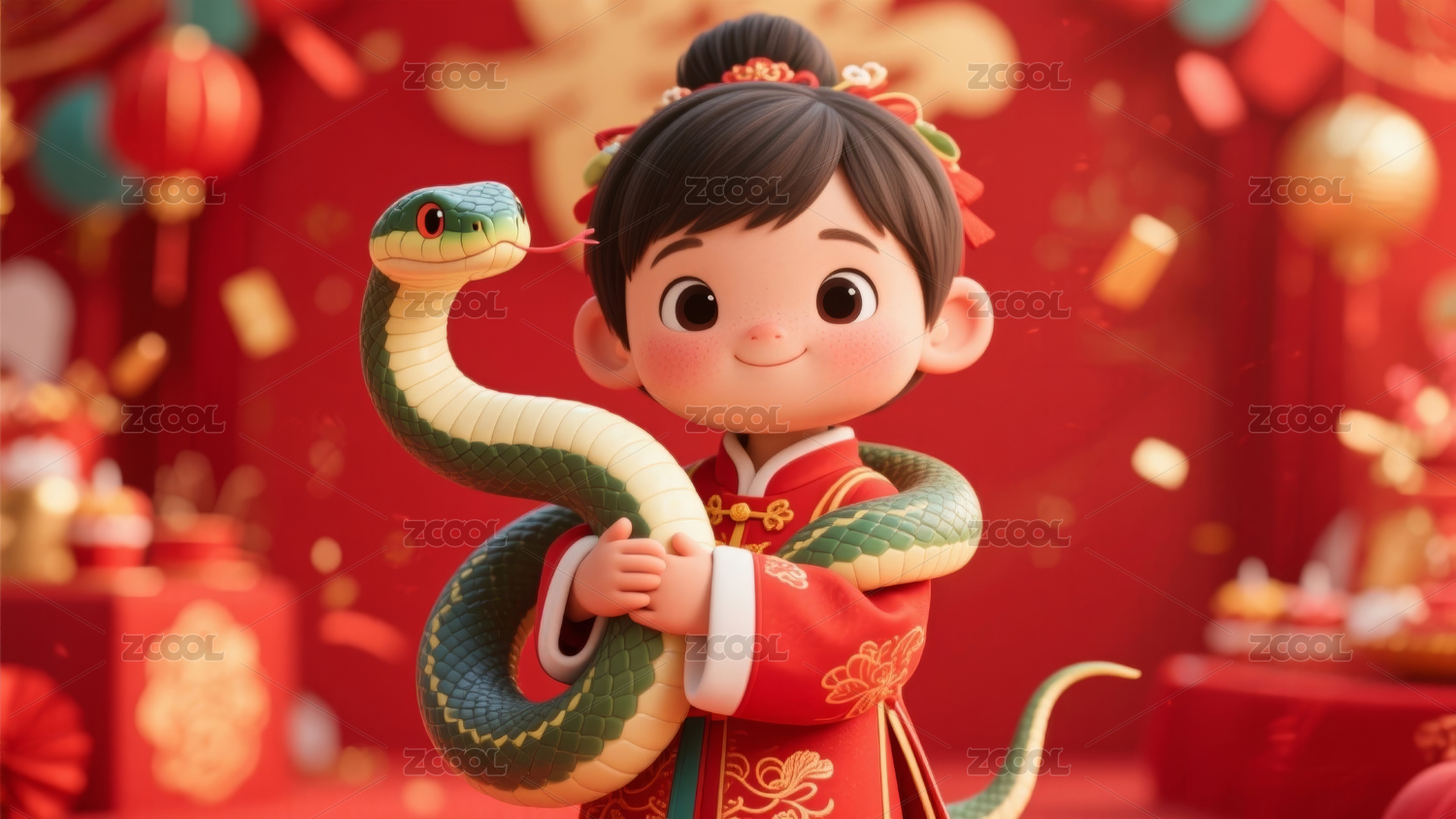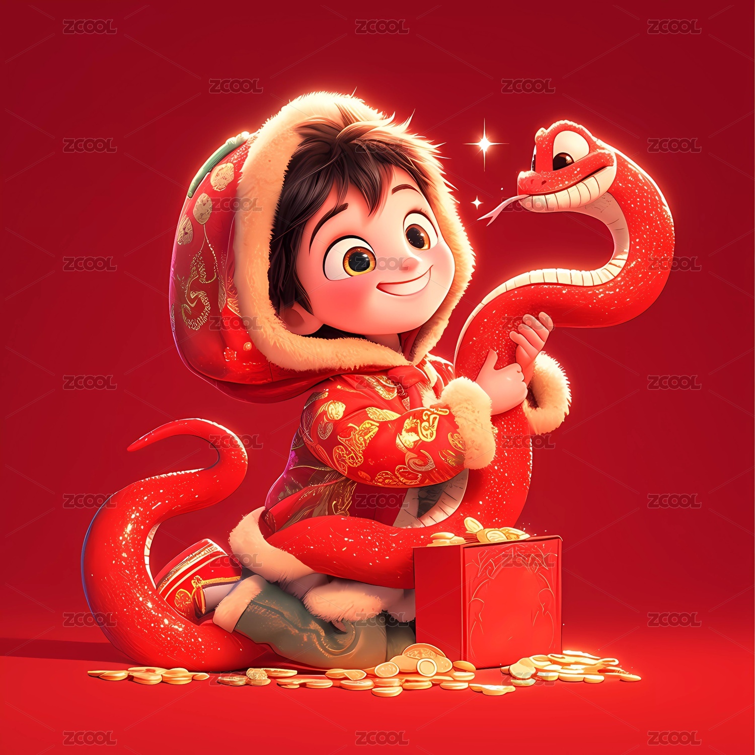 红色背景儿童抱着金红色蛇飞着金币素材